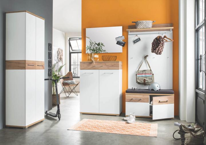 Wunderschönes Garderobenprogramm in Weiß mit Absetzungen in Eiche Navarra Nachbildung, mit Metallgriffen und Türdämpfern und Schubkästen mit Selbsteinzug.