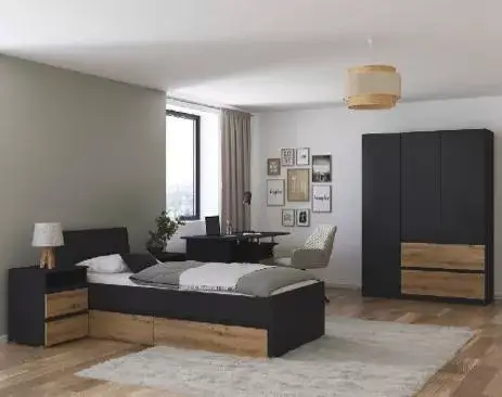 Jugendzimmer mit Korpus in Grau metallic und Front in Eiche Artisan Nachbildung. Optional auch komplett in weiß.