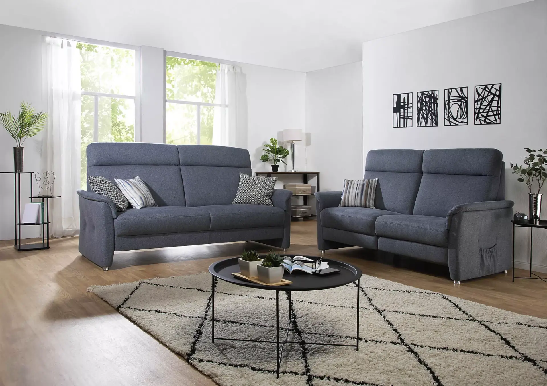 Sitz: Blocksitzoptik, Nosagunterfederung mit Filzabdeckung Hochwertige Polyschaumabdeckung und Fillauflage Legere Polsterung Federkernpolsterung in unterschiedlichen Aufbauten und Sitzkomforts möglich Zwei Sitzhöhen