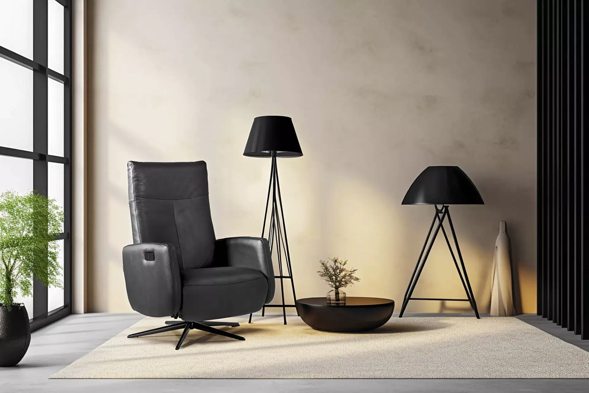 Angesagter Relaxsessel mit manueller Bedienung, 360° drehbar mit verstellbarer Rückenlehne an der Innenseite und Easy-Go Fußstütze. Fixed Kopfteil.