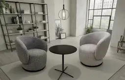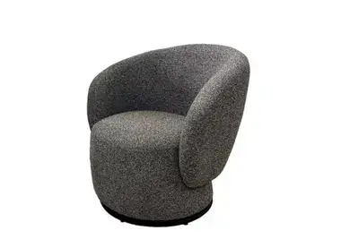 Loungesessel mit Strukturgewebe. Getragen von einer Bodenplatte in Metall schwarz matt, pulverbeschichtet. Drehbar bis 360°C. Erhältlich in anthrazit oder beige.