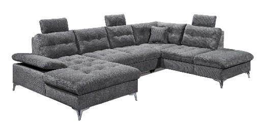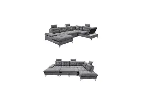 Großzügige Wohnlandschaft mit strapazierfähigem Bezug in grau, Vinci 14 Titan, Füße Kaschmir, Nosagunterfederung, Rückenkissen mit Flockenfüllung, mit Bettkasten im Hocker, Schlaffunktion mit Delfinbeschlag, 1x Armteilverstellung und 3 variabel steckbaren Kopfstützen, Stellmaß ca. 170x324x218 cm, Liegefläche ca. 128x250 cm, auch seitenverkehrt erhältlich.