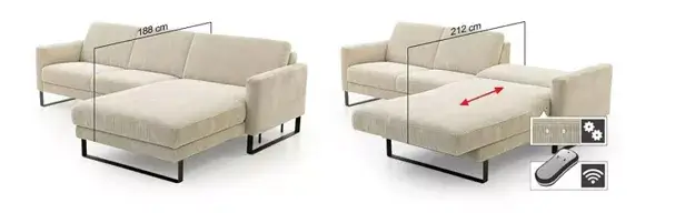 Moderne Sofalandschaft in verschiedenen Sitzausführungen, zwei Sitztiefen, unterschiedlichen Armlehnenvarianten und motorischen Relaxfunkionen.