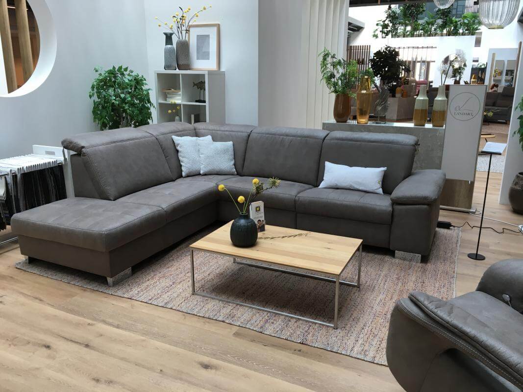 Wohnlandfschaft mit Stoff Taurus platin (SG 14) - Nutzschicht 100% Polyester/Grundschicht 75% Polyester/25% Lederfaser, Sitz Kaltschaum (Federkern preisgleich), ummantelt mit Polstervlies auf dauerelastischen Wellenfedern, Doppelsteppnaht mit Kontrastfaden beige, Metallfuß chrom, bestehend aus: