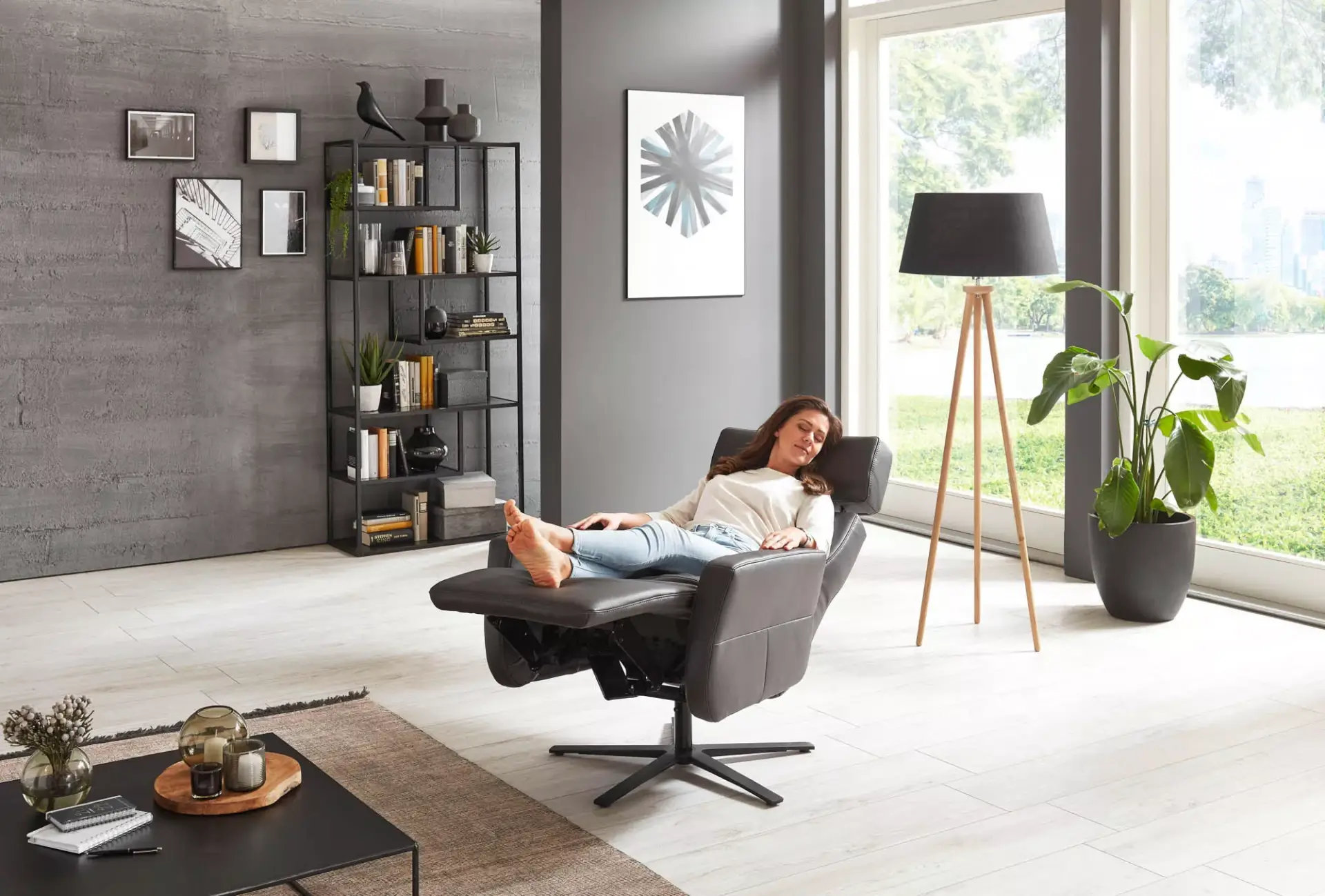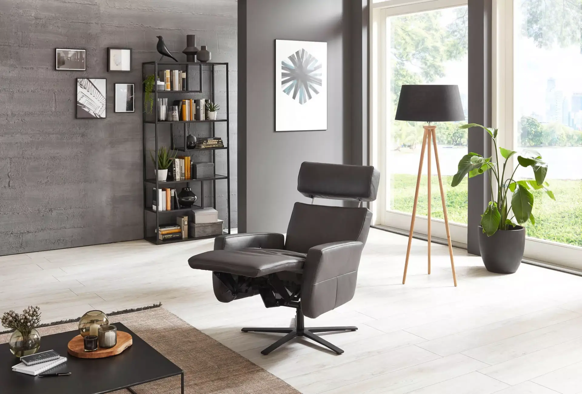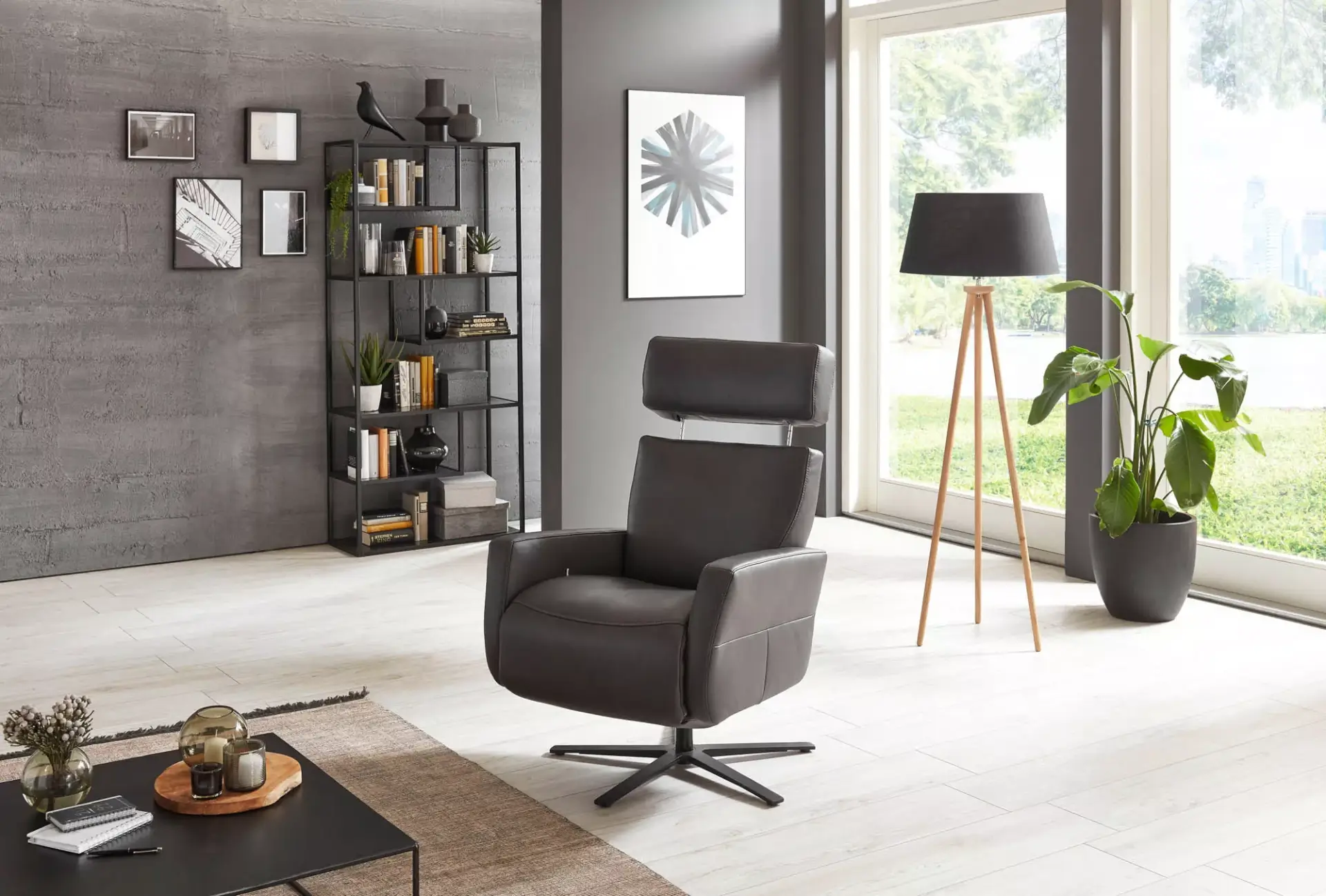 Stylischer Relaxsessel mit Kopfteilverstellung und manueller Funktion, in zwei Sitzqualitäten, drei Fußvarianten und optional mit motorischen Funktionen.