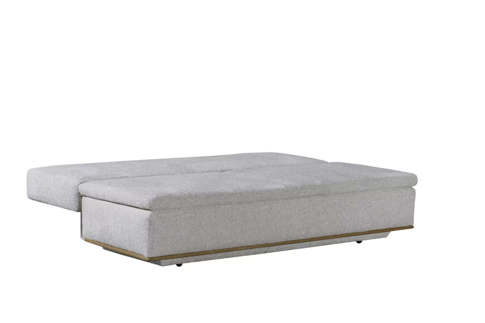 Querschläfer mit Bettkasten und einem Federkernsitz bei einer Liegefläche von 160 x 205 cm. Durch Vorziehen der Sitzfläche und Herunterklappen des Rückenteils entsteht eine Doppelliege. Schlafen auf Sitzhöhe.