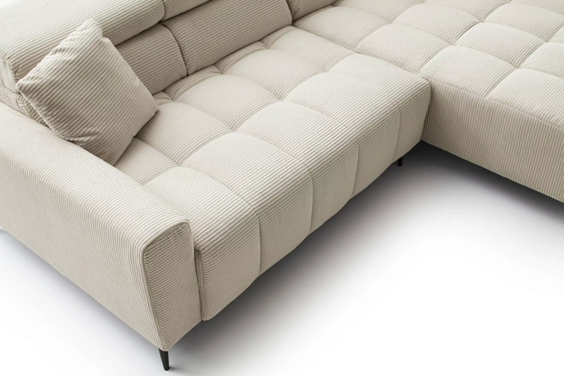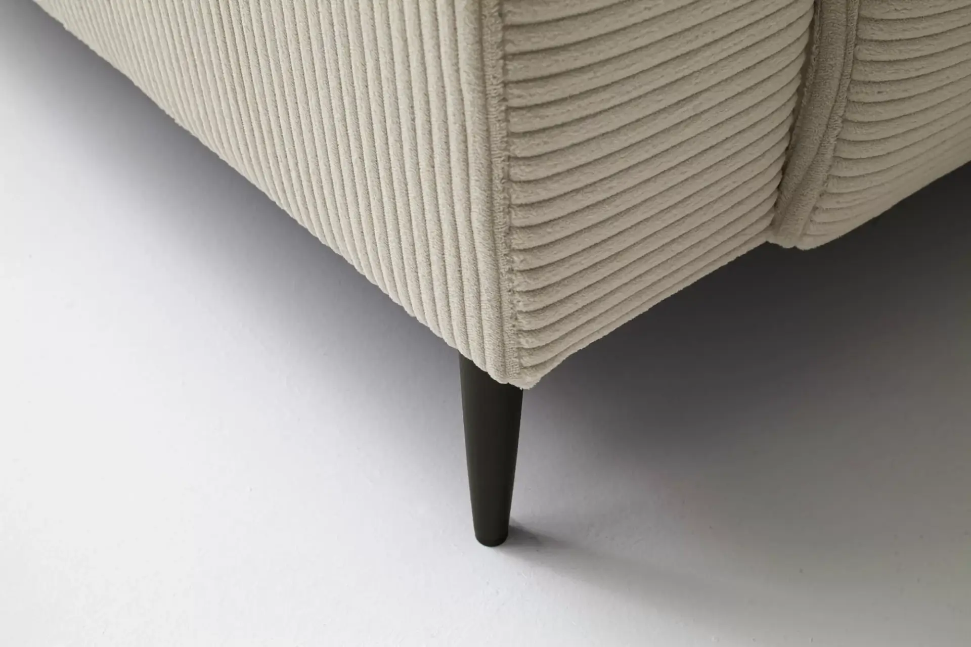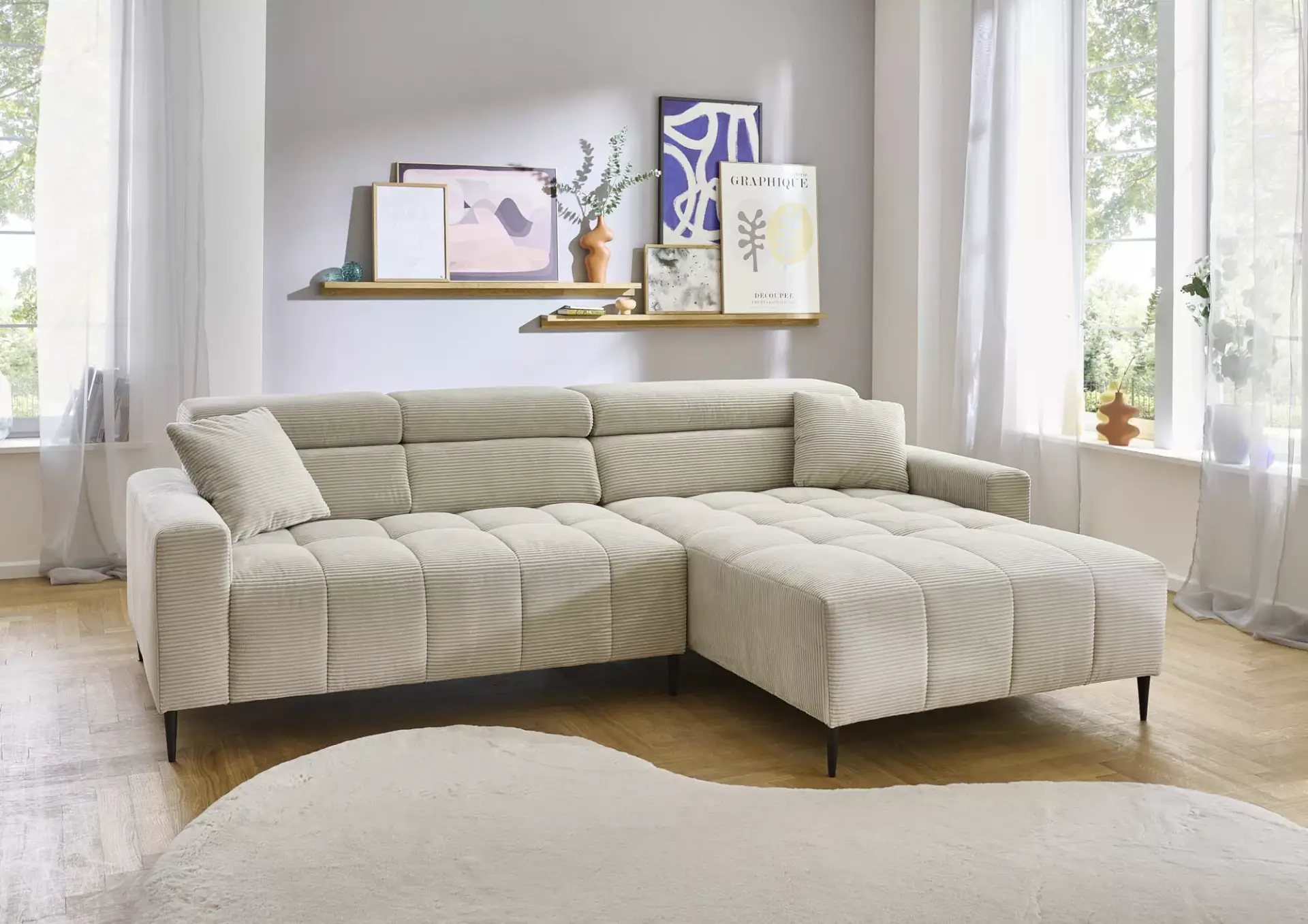 Brandneue Polstergarnitur mit Bezugsstoff Cord beige Hydra 23 (PG1), Nosagunterfederung, Polyätherschaumpolsterung, Metallfüße schwarz gepulvert, elektrische Sitztiefenverstellung, 3 manuelle Kopfteilverstellungen, inklusive 2 mittlere Kissen, Schenkelmaß ca. 256x180 cm, Liegefläche ca. 93x221cm, Sitztiefe ca. 93/66cm (ohne/mit Kissen), Sitzhöhe ca. 45cm, auch seitenverkehrt erhältlich.