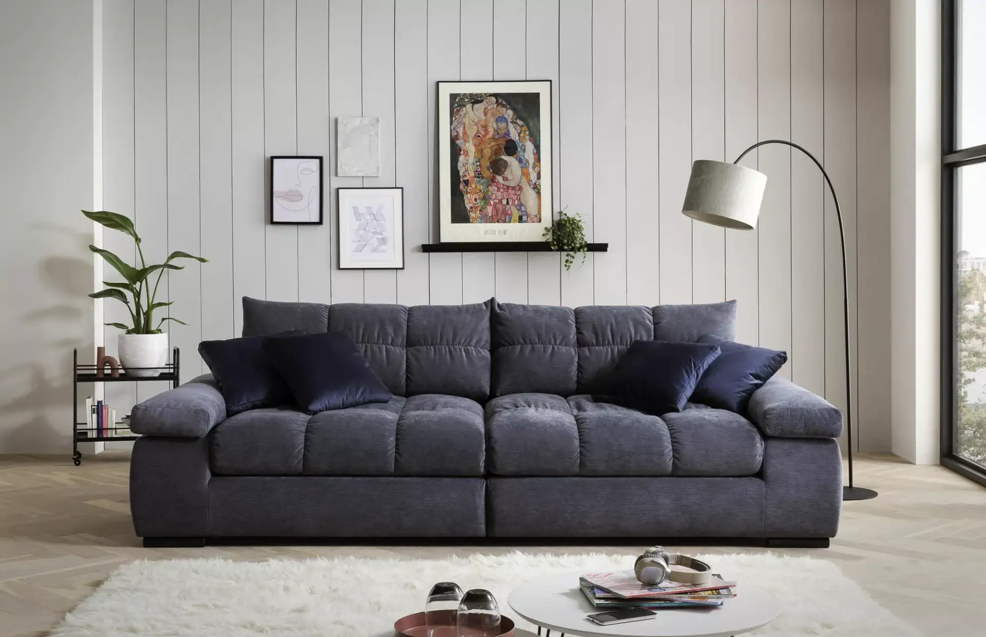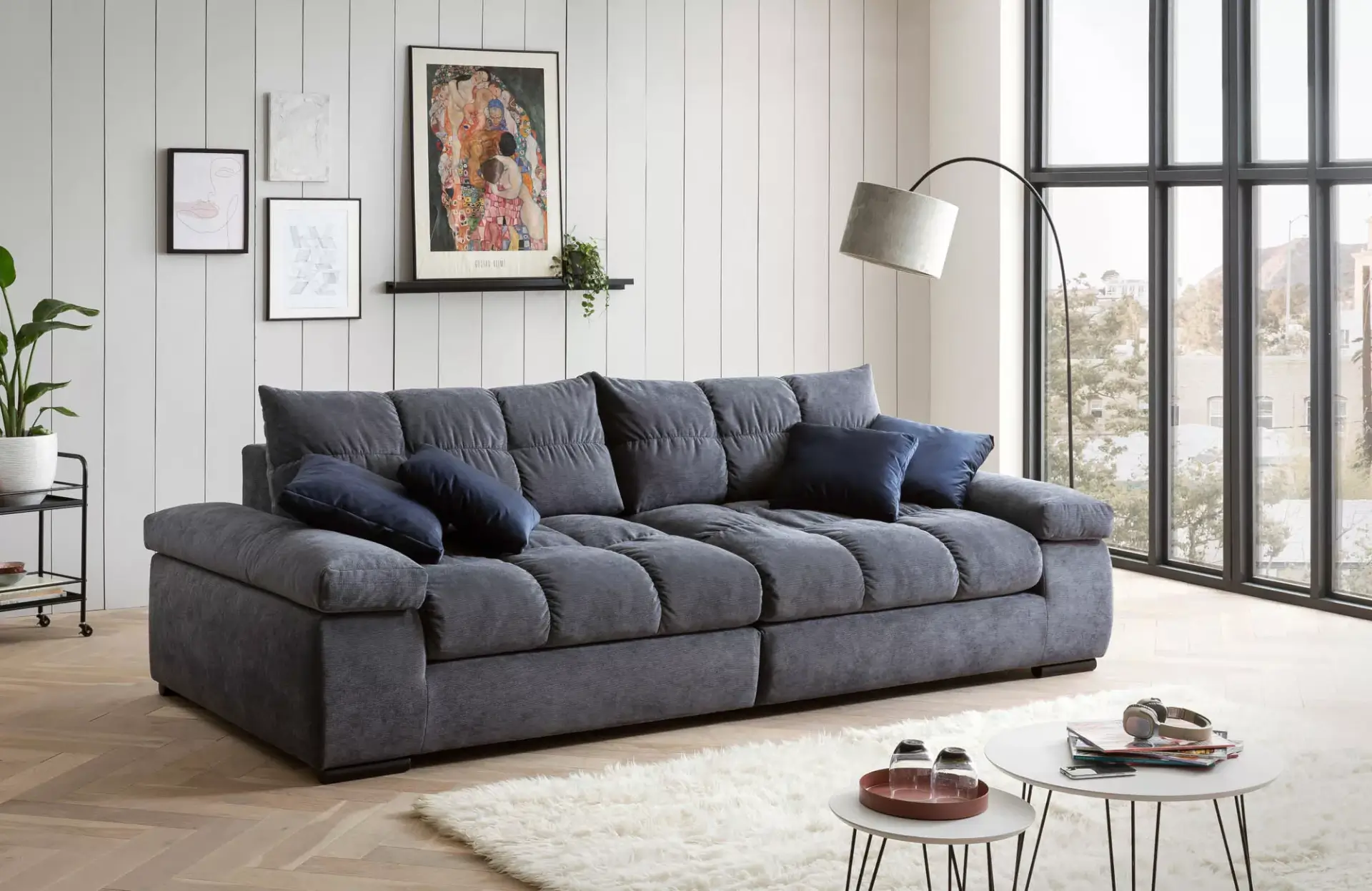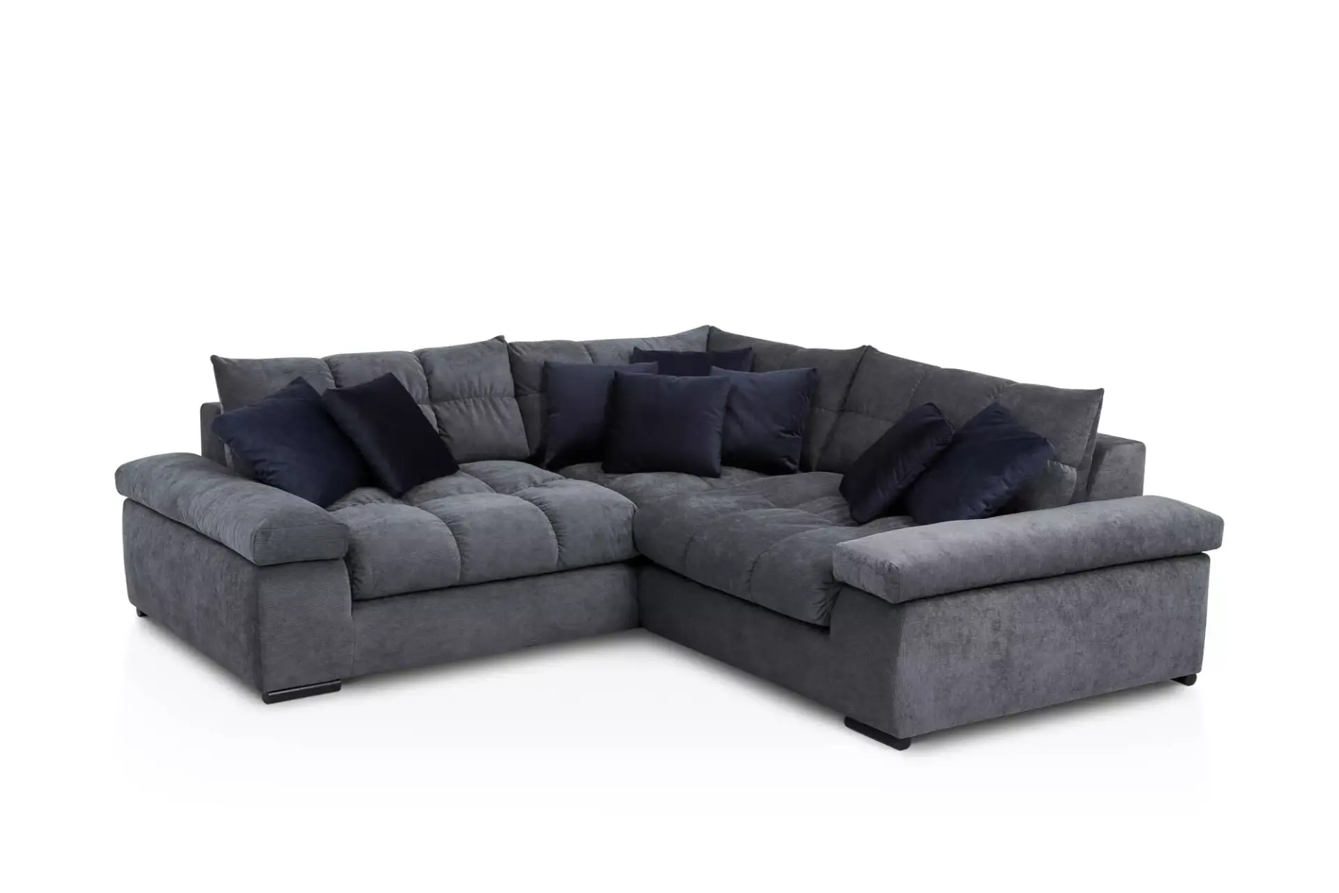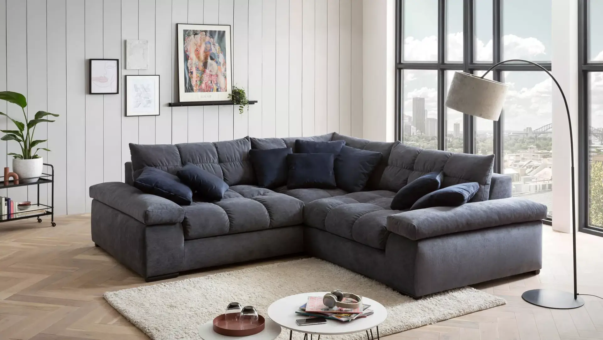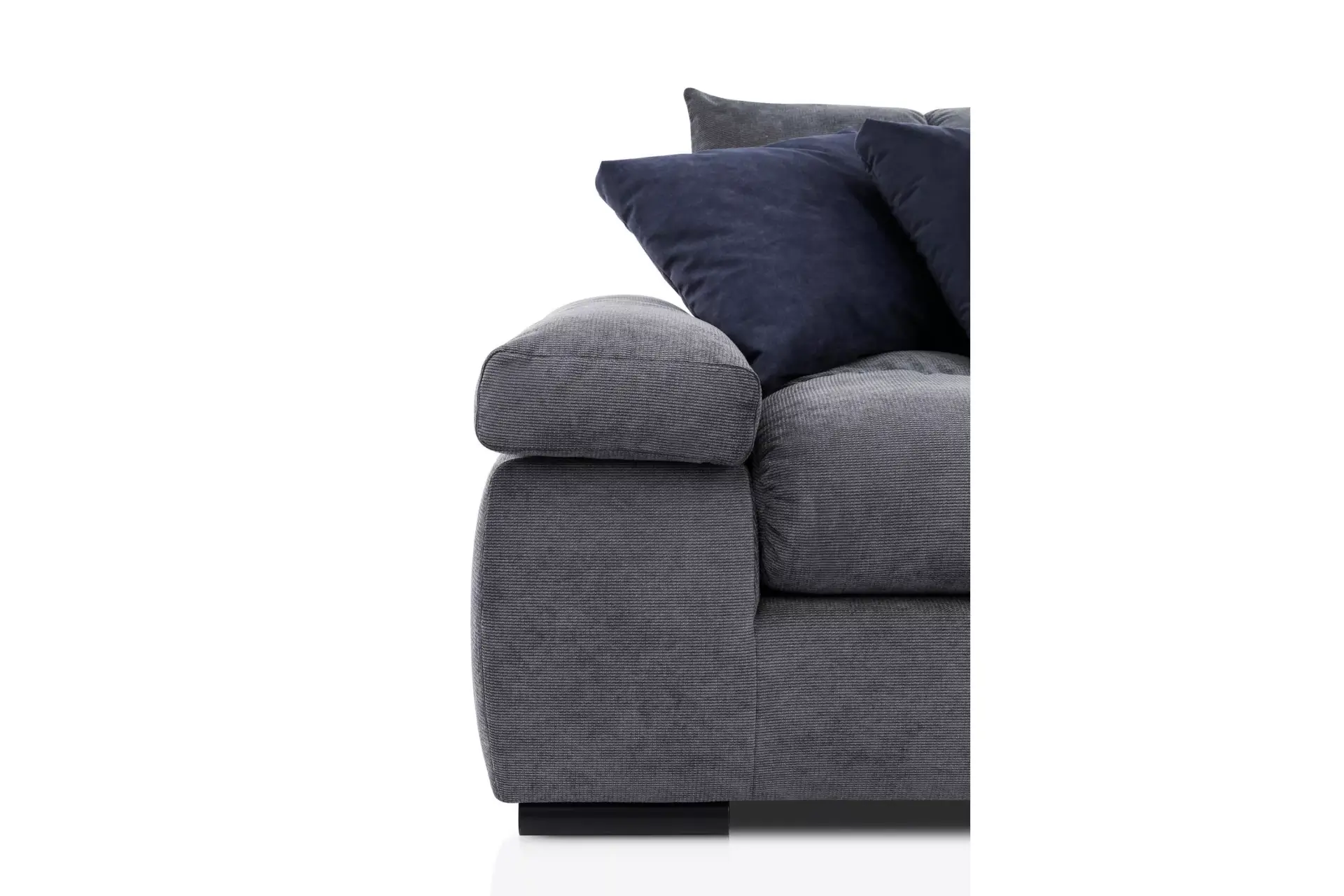 Wohnlandschaft mit strapazierfähigem Bezug in anthrazit, Dilara 90, Metallfüße schwarz matt, inkl. 4 Rückenkissen und 2 Luxus-Zierkissen in strapazierfähigem Bezug Samt dunkelblau, Velvet 37 midnight und 3 Luxus-Armlehnkissen in strapazierfähigem Bezug blau Bellalux 5511 blue, Schenkelmaß ca. 284 x 284 cm.