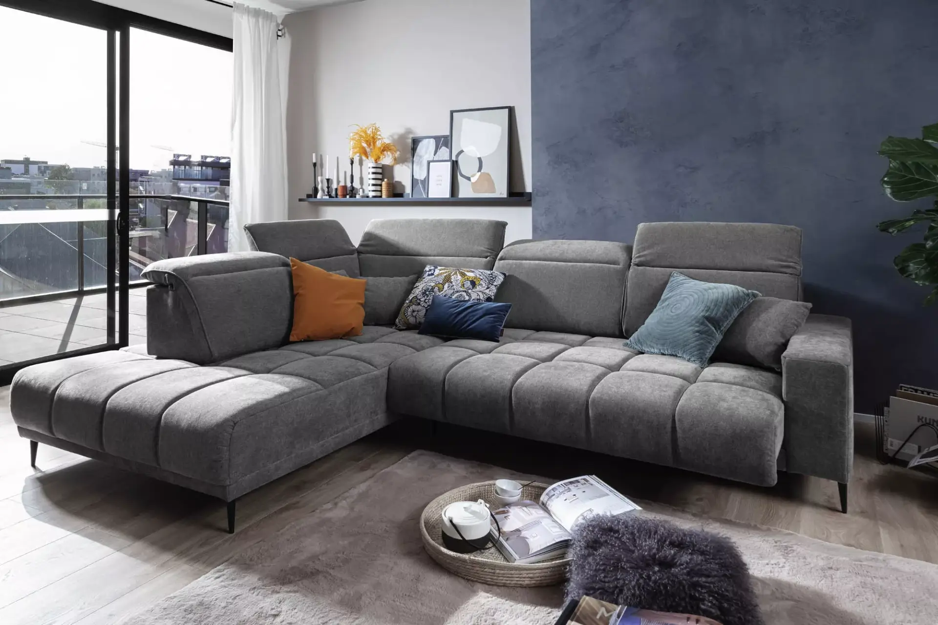 Wohnlandschaft mit Umbauecke,Typ 003, strapazierfähiger Bezug in grau, Storm 97 (PG4), Metallfüße schwarz matt, Polsterung Nosagunterfederung und Federkern, inkl. 1 manuellen Sitztiefenverstellung, elektrischer Sitztiefenverstellung (30cm), 5 Kopfteilverstellungen und 3 Kissen, Schenkelmaß ca. 230 x 317 cm, Sitzhöhe ca. 44 cm, Ottomanenbreite ca. 134 cm.