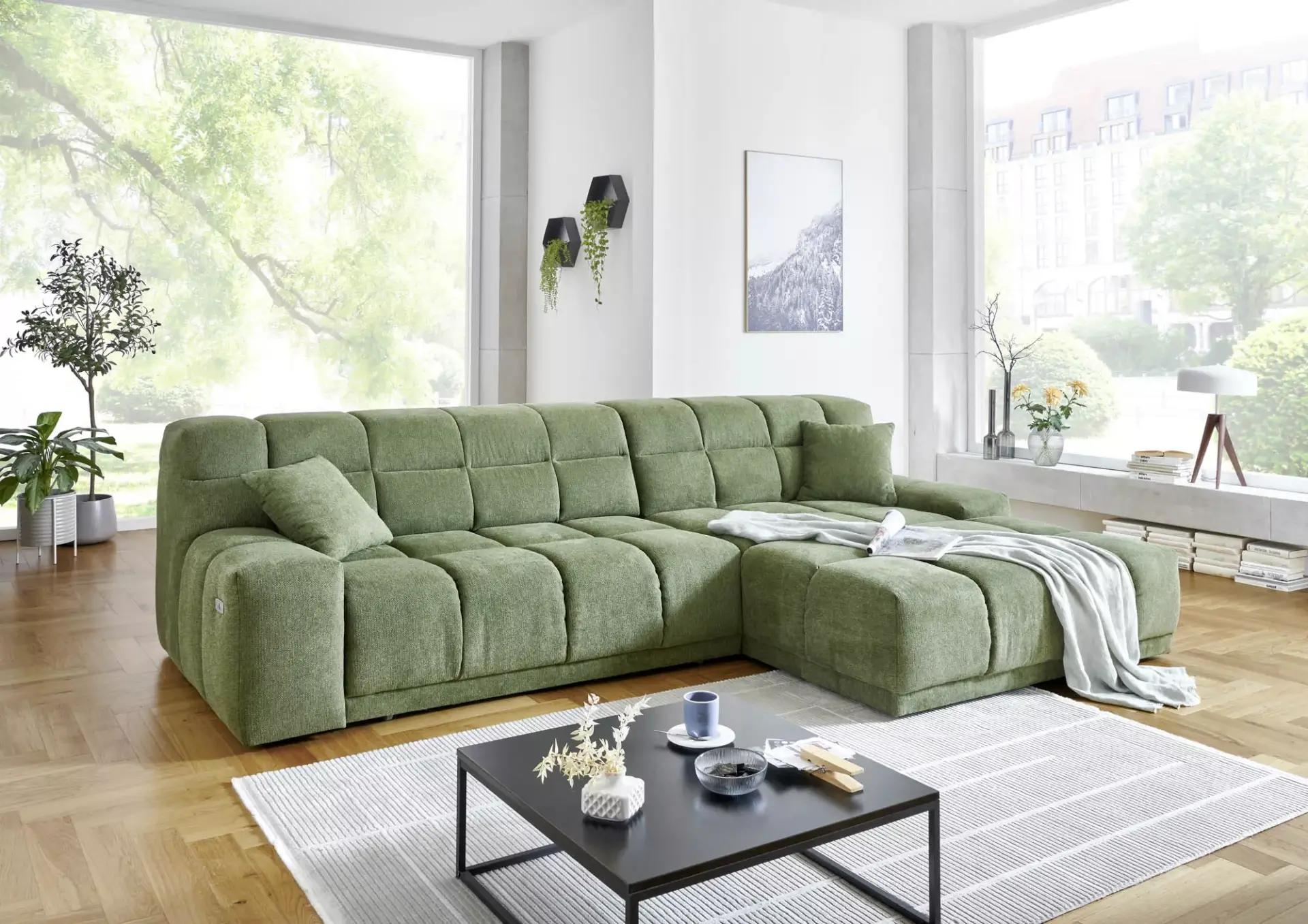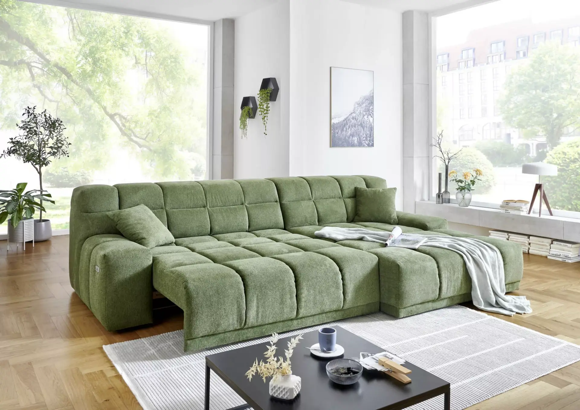 Begehrte Wohnlandschaft mit Bezug Curio 84 (PG1), Nosagunterfederung, Schaumstoff, inklusive elektrischer XXL-Sitztiefenverstellung (60cm), inklusive 2 Zierkissen, Schenkelmaß ca. 309x196 cm, Liegefläche ca. 125x243cm, Sitzhöhe ca. 42cm, rechts/links bestellbar.