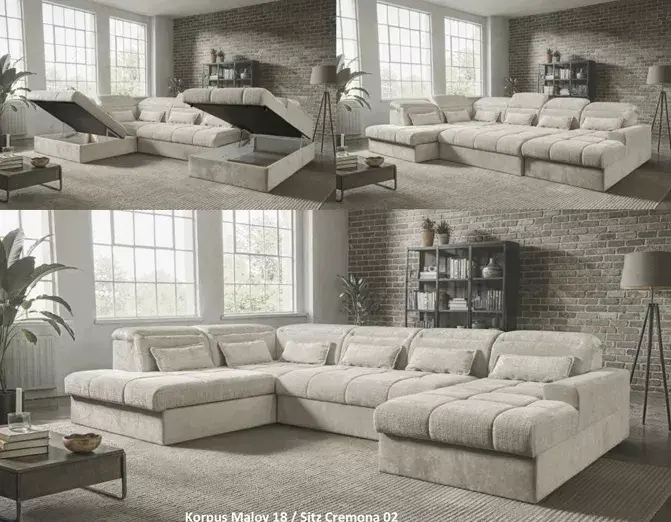 Wohnlandschaft mit Bezug Korpus Maloy 24 (PG1) / Sitz Cremona 02 (PG3), Nosagunterfederung, Polyätherschaum, Kunststoffgleiter schwarz, inklusive 6x manuelle Kopfteilverstellung, mit Bettfunktion inklusive 2 Bettkästen, Schenkelmaß 235x355x192cm, Gesamthöhe 75-100cm, Sitztiefe 82cm, Sitzhöhe 45cm, Tiefe der Ottomane 192cm, Tiefe der Umbauecke 240cm, Liegefläche 400x148cm