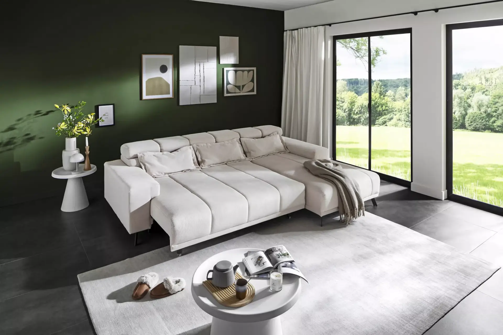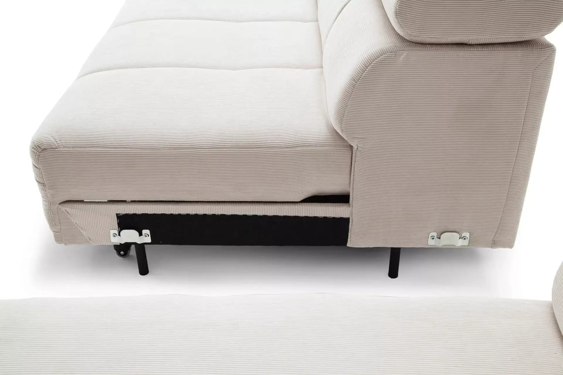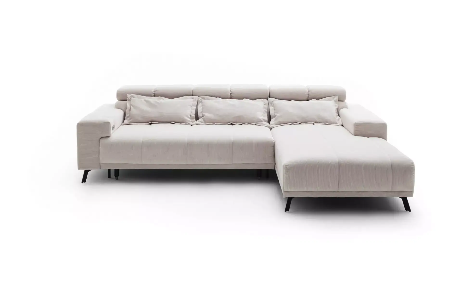 Wohnlandschaft mit Bezug Fjord 23 Beige (PG1), Nosagunterfederung, Bonellfederkern, Metallfüße schwarz (alternativ creme oder chrom), inklusive elektrischer XXL-Sitztiefenverstellung (60cm), 3 manuelle Kopfteilverstellungen, inklusive 3 Flatterkissen, Schenkelmaß ca. 285x201cm, Liegefläche ca.130x222cm, Höhe ca.79 bis 99cm,Sitztiefe ca.70 bis 130cm, Sitzhöhe ca.45cm, auch seitenverkehrt erhältlich.