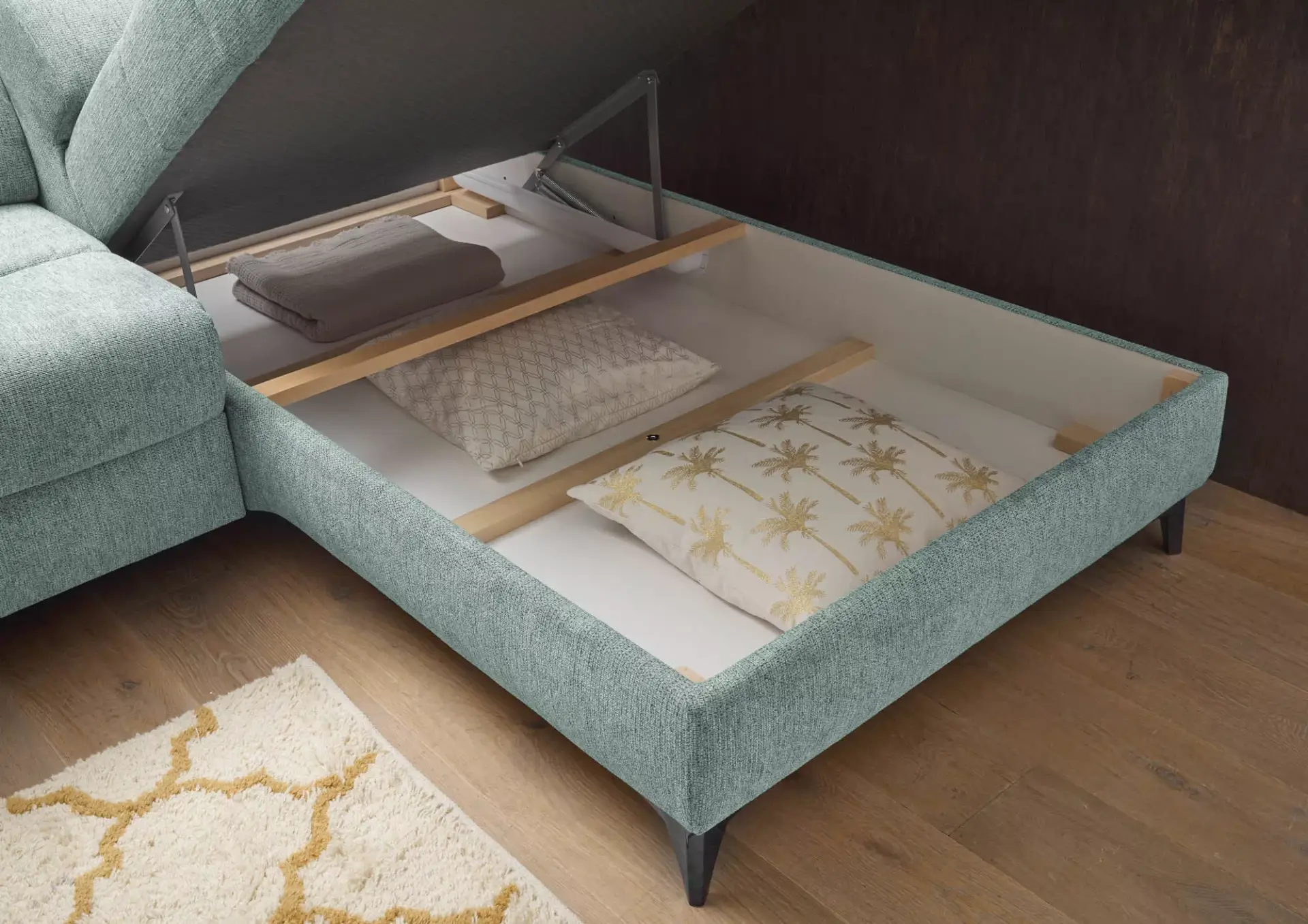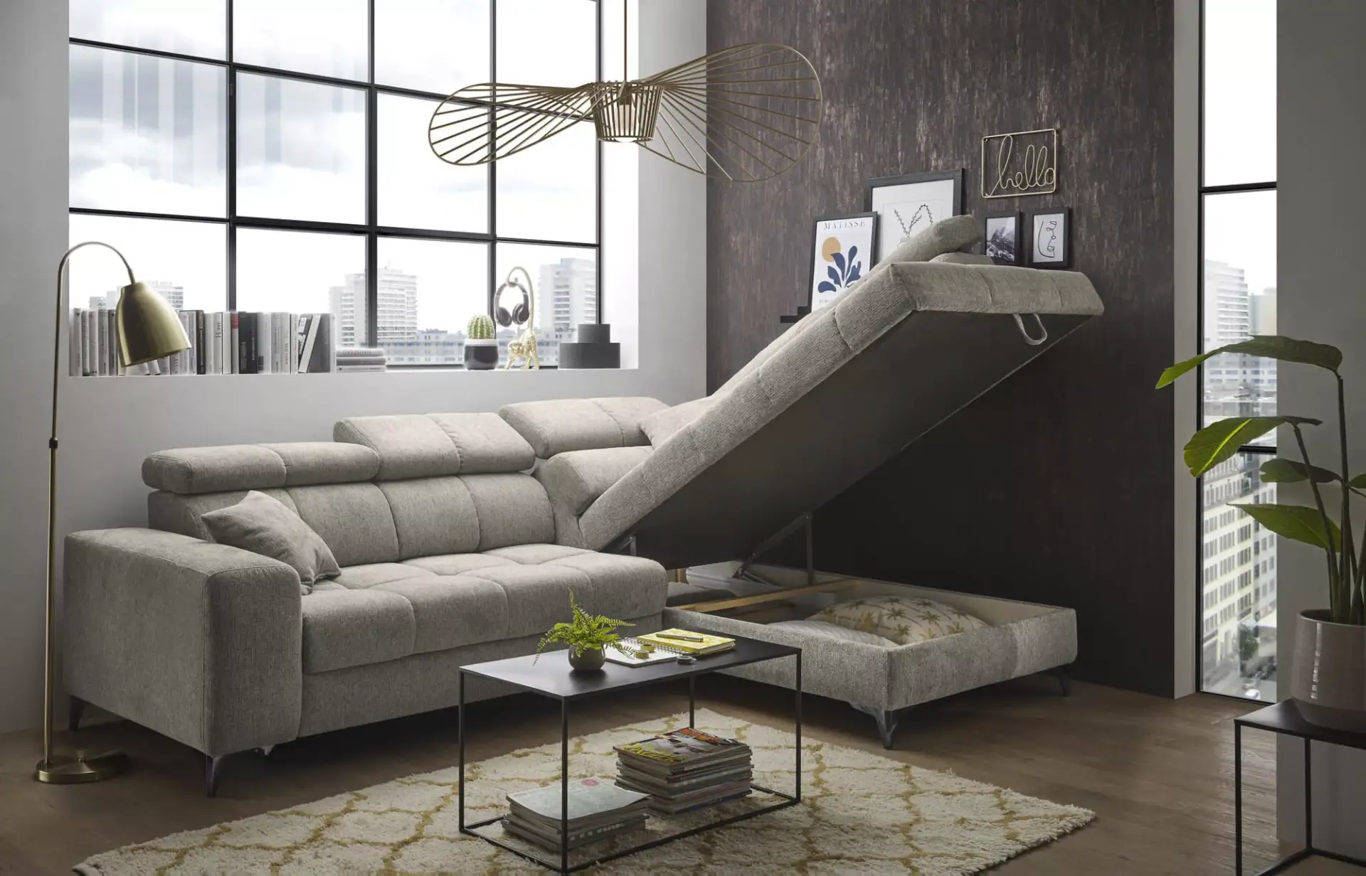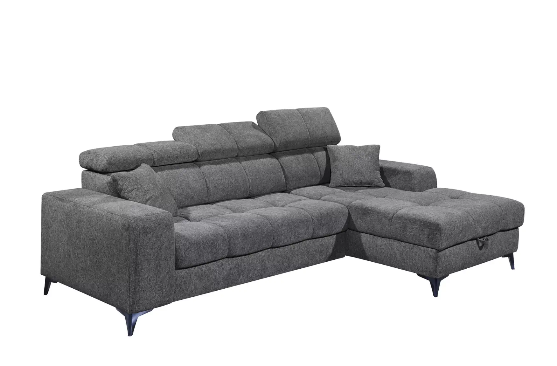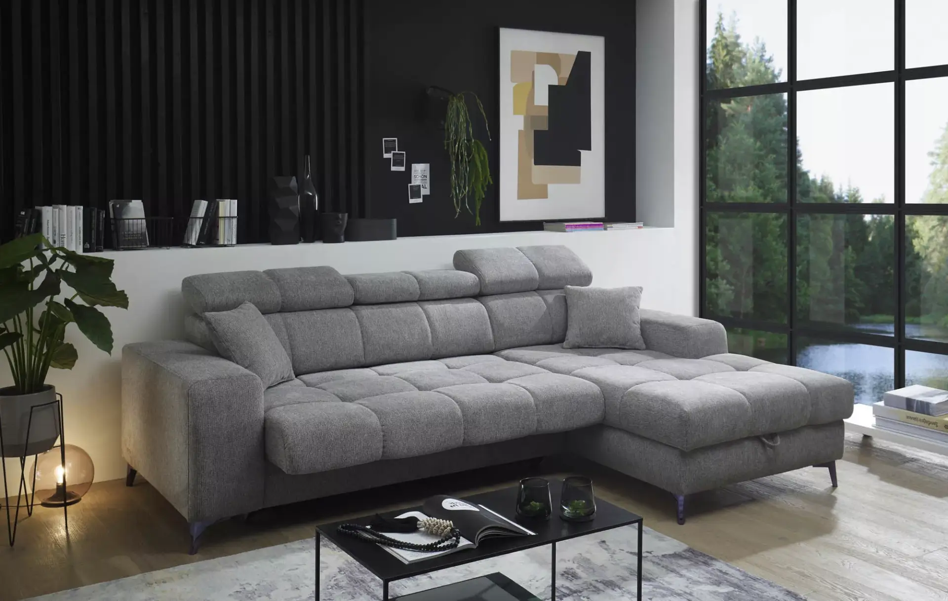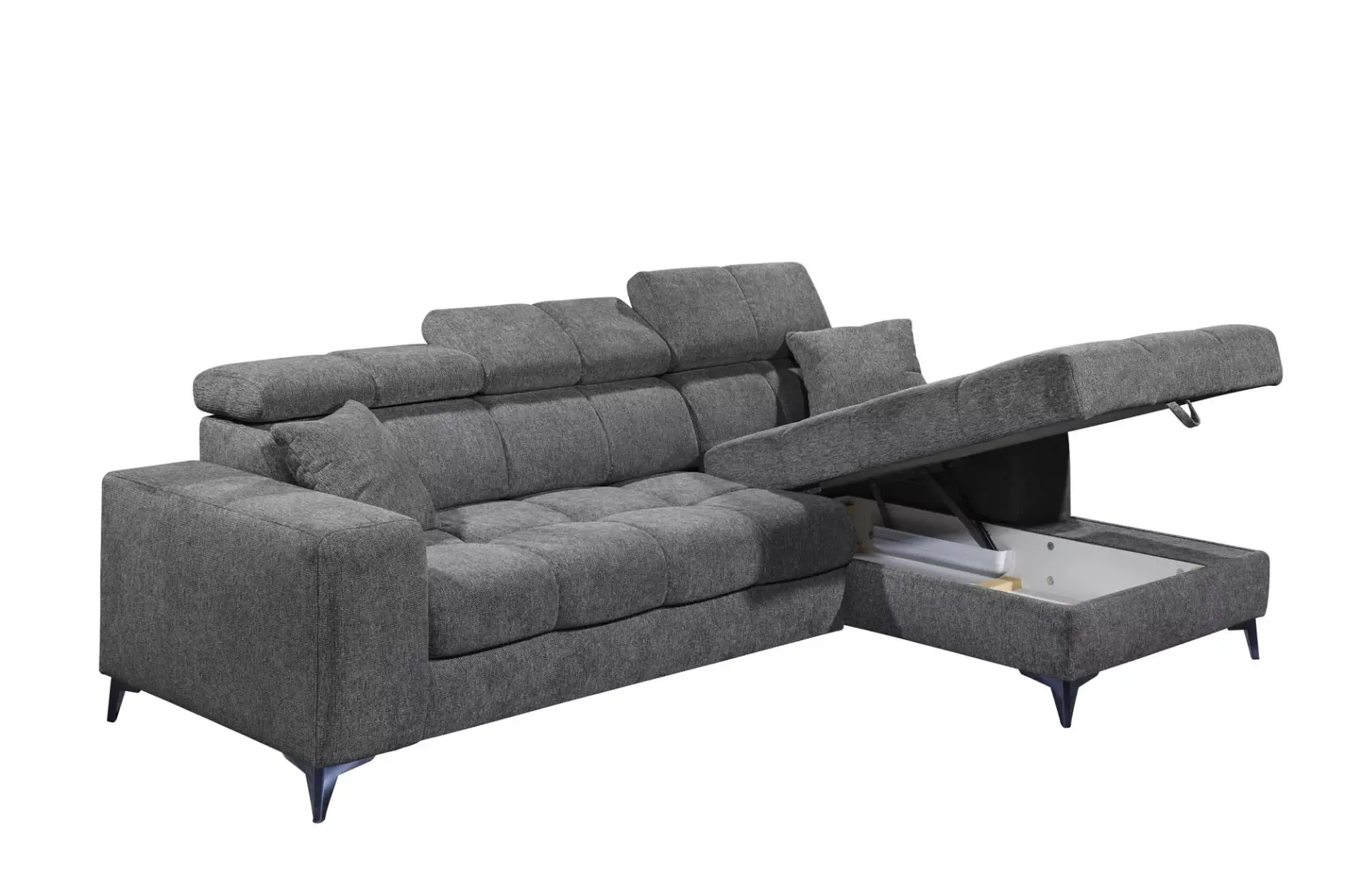 Wohnlandschaft in Glow 19 anthrazit -92% Polyester/8% Nylon, Sitz mit Nosagunterfederung, Rücken mit Schaumstoffpolsterung, Füße Kunststoff, Schlaffunktion, Bettkasten, inklusive 3 Kopfteilverstellungen, Rücken echt, Liegefläche ca.210x128cm, Stellmaß ca.268x86x172cm, SH ca.48cm, ST ca.60cm