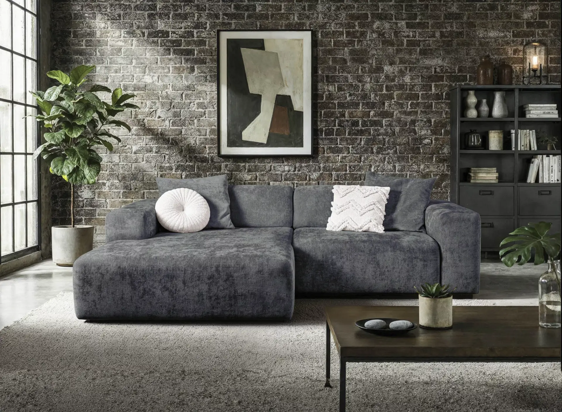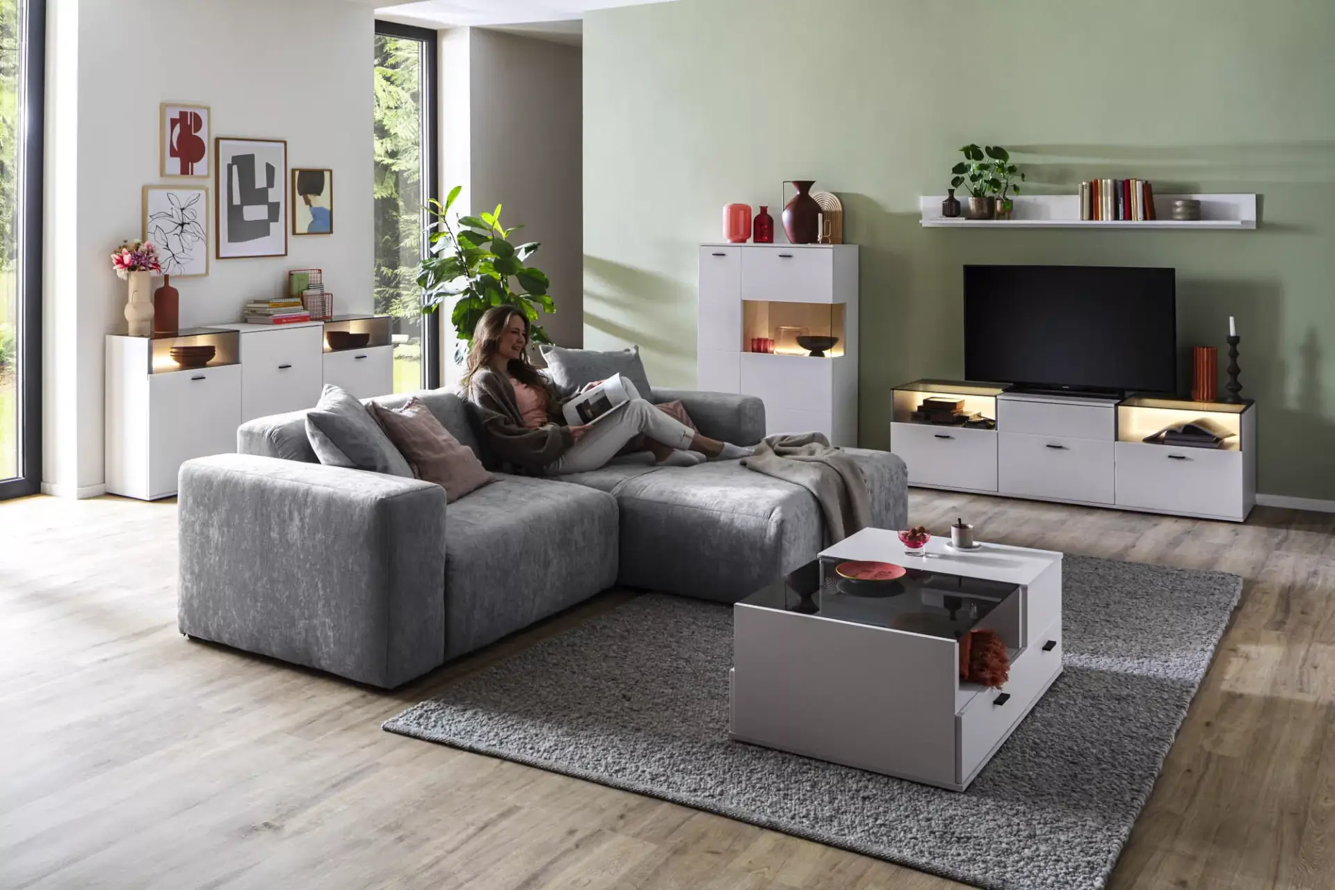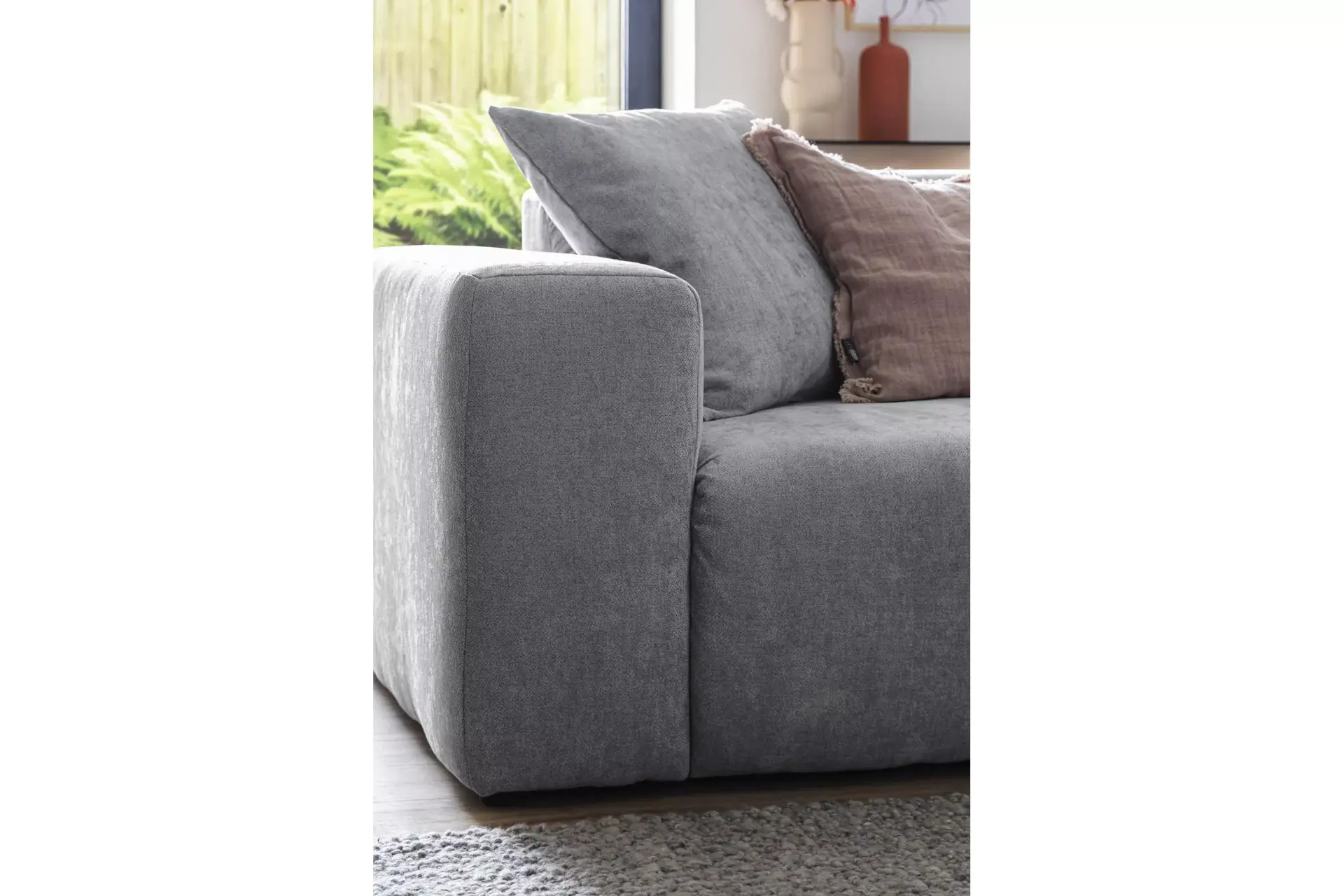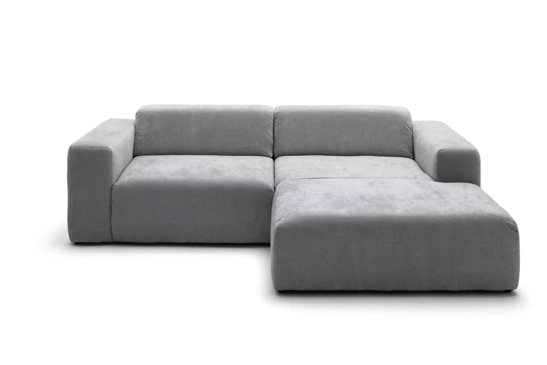 Moderne Wohnlandschaft mit Bezug Cremona 95 silbergrau (PG3), Kunststofffüße schwarz, Nosagunterfederung, 2-lagiger Hypersoftschaum, Raumgewicht VP40/VP28, Stellmaß 174x256 cm, Sitztiefe 70 cm, Sitzhöhe 44 cm, Gesamttiefe 104 cm, Gesamthöhe 75cm