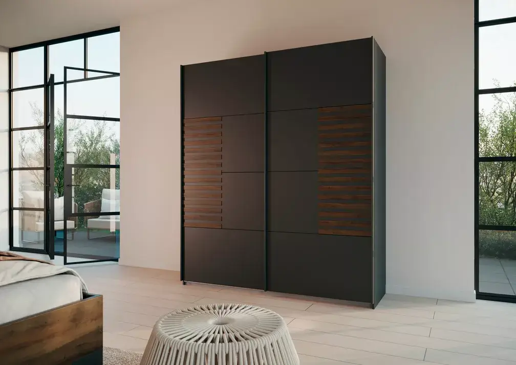 Die Schlafzimmer-Serie Barea verbindet den trendigen Lamellen-Look mit durchdachtem Stauraum. Die modernen Dekorfarben Champagner und Graumetallic kombiniert mit den dunklen Lamellen im Holzton Atlantic Oak dunkel setzen besonders stilvolle Akzente. Für das Extra an Komfort bietet das Bett ein farblich abgestimmtes Kopfteil mit weicher Polsterauflage. Es ist nicht nur ein ästhetischer Blickfang, sondern sorgt auch für zusätzlichen Komfort beim Lesen oder Fernsehen im Bett.