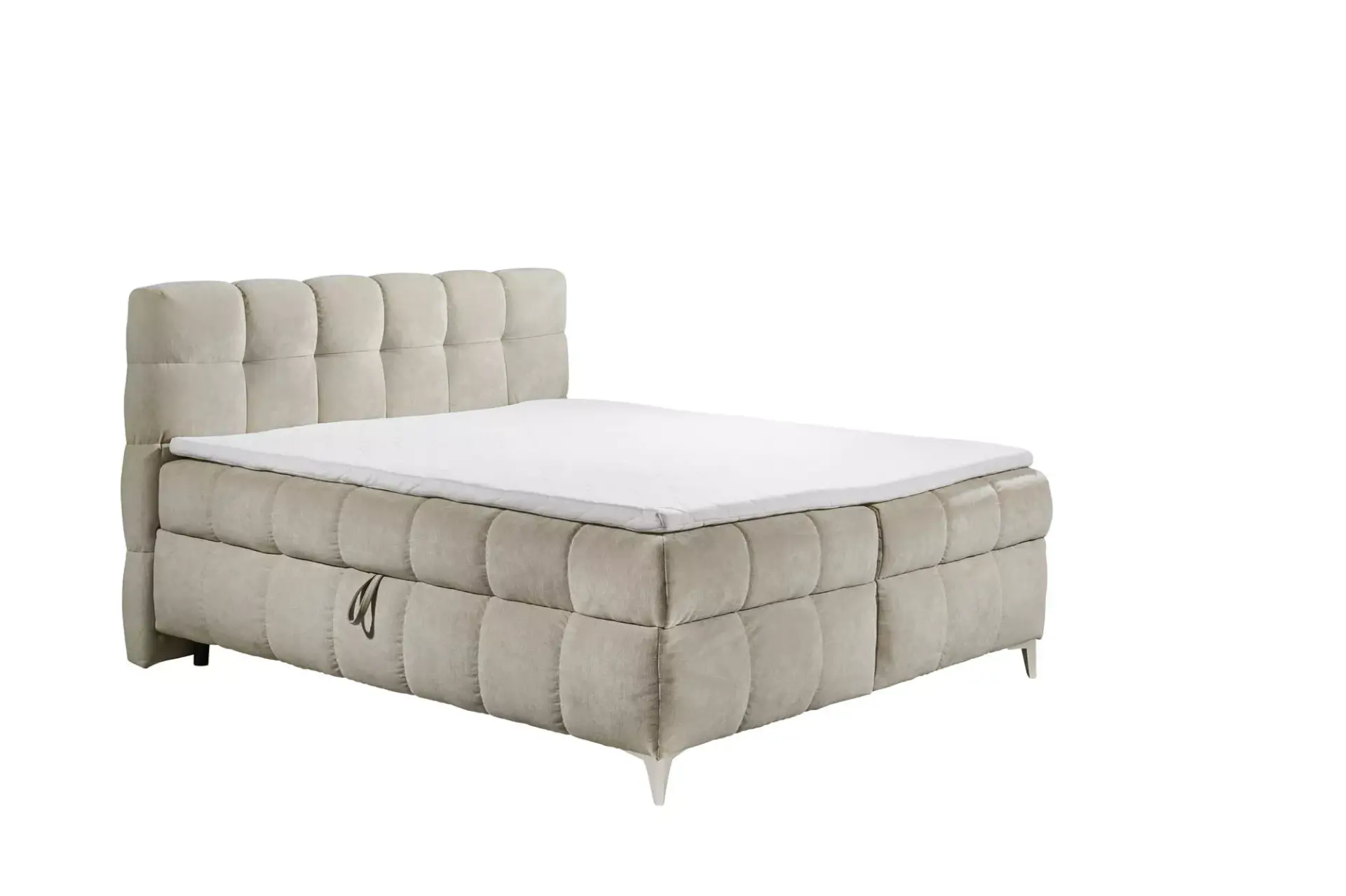 Modisches Boxspringbett mit stabiler Box, einem seitliche zu öffnenden Bettkasten, Matratze mit Härtegrad 2 und einem HR 30-Topper (40cm), waschbar.