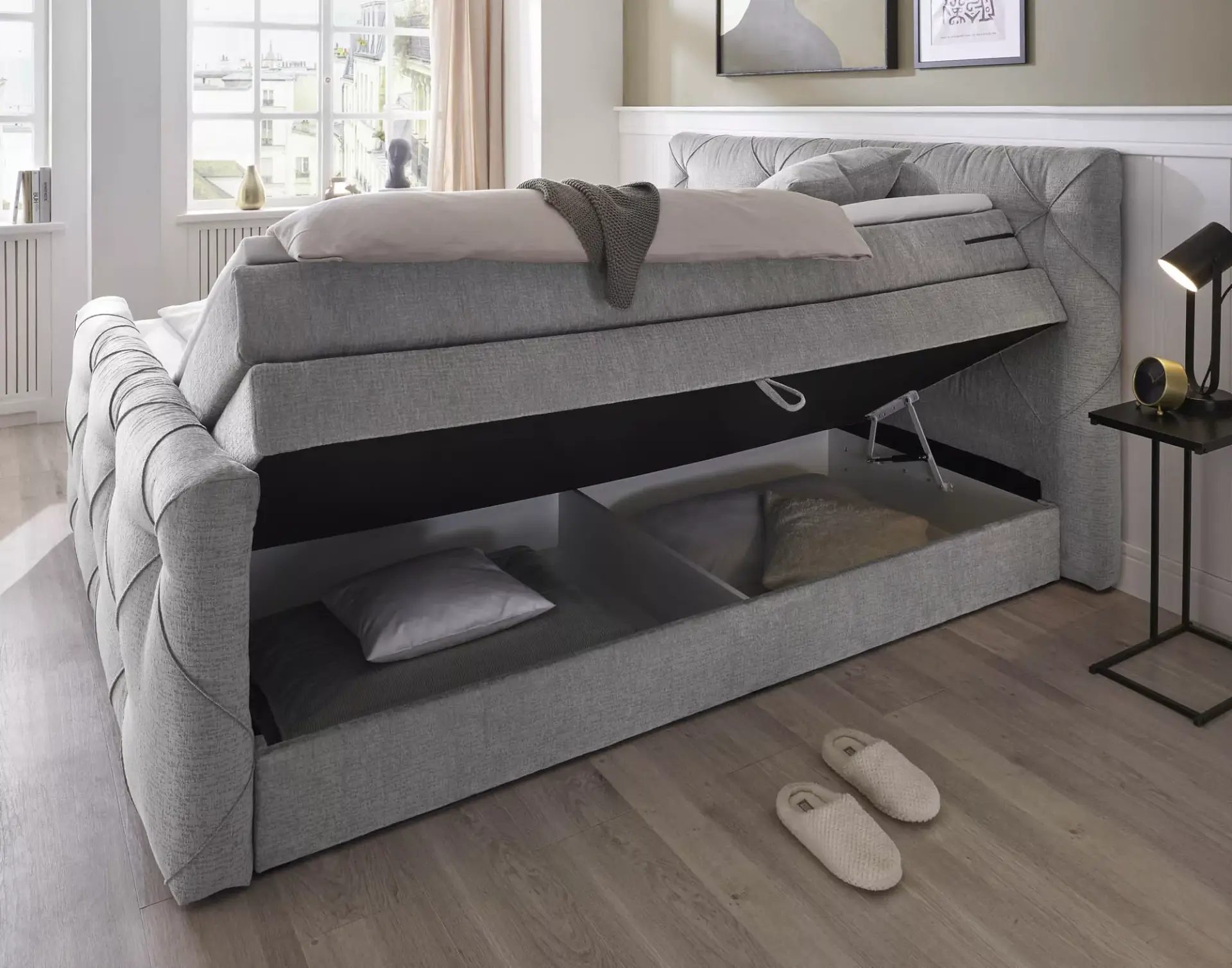 Angesagtes Boxspringbett mit einer Tonnentaschefederkern-Obermatratze, einem HR 30-Topper (4cm) und einem großzügigem Stauraumfach.