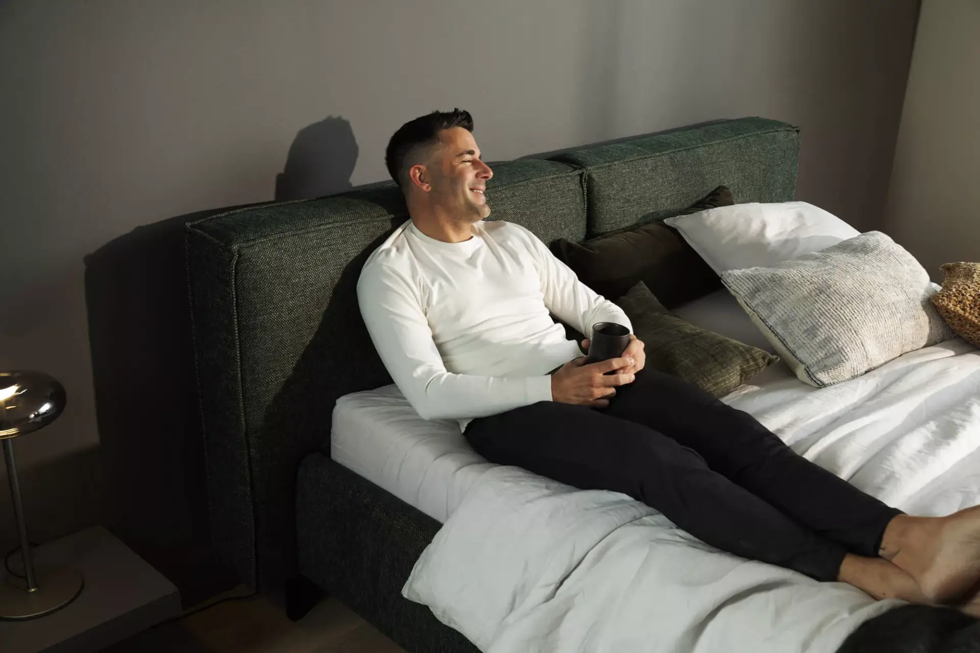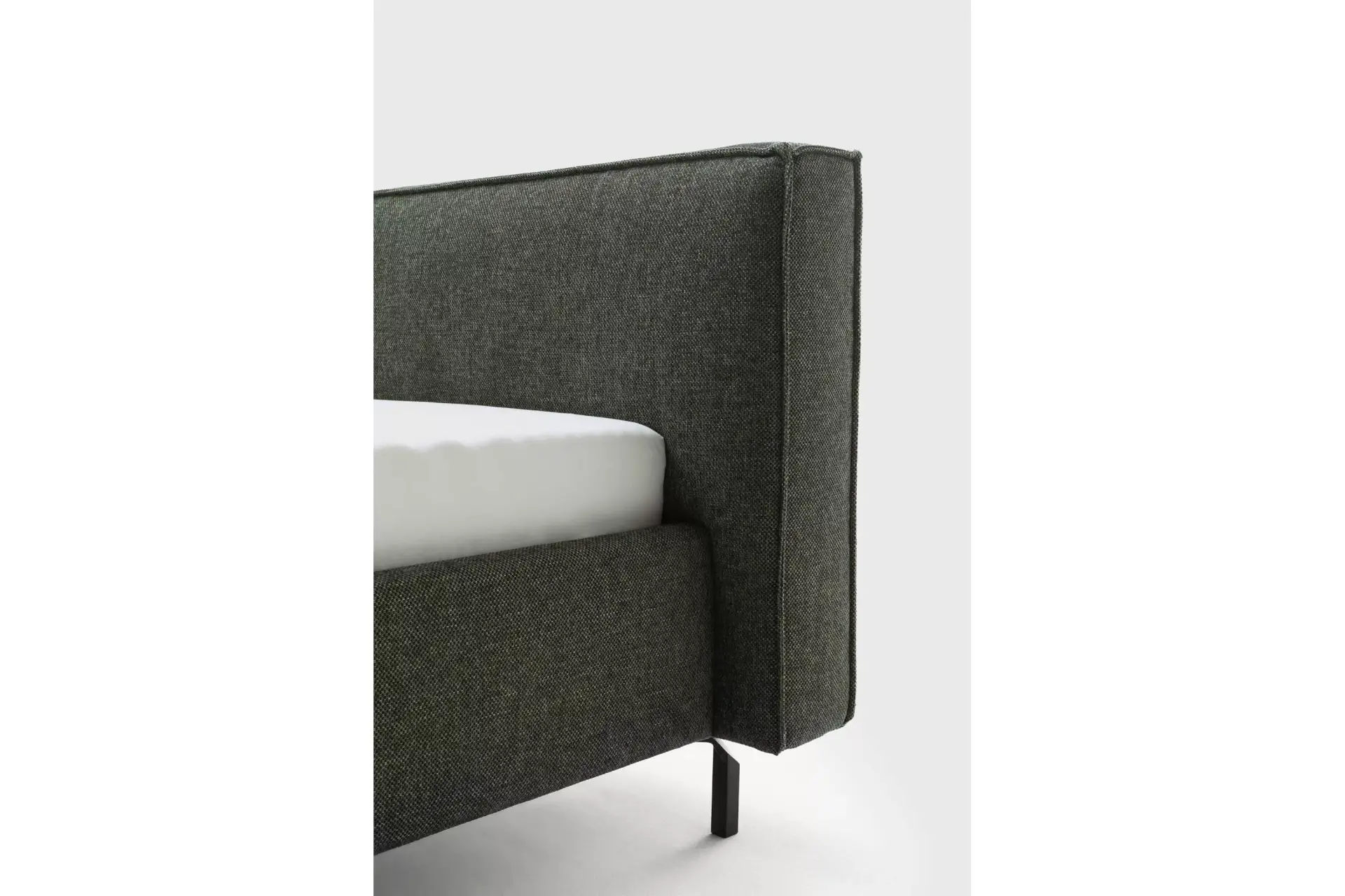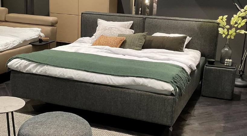 Wunderschönes Polsterbett 180 x180 cm, mit Metallfuß 481 matt und dem Bezugsstoff Novara Clean olive. Alle Betten sind mit Mittelsteg versehen. Sie haben ein Stauraumfach und können aus einer großen Auswahl an Fußvarianten auswählen.