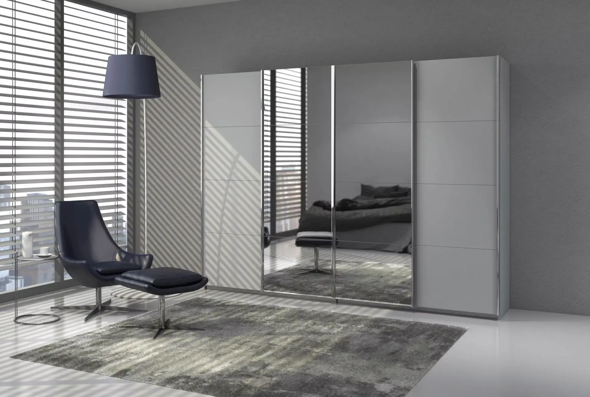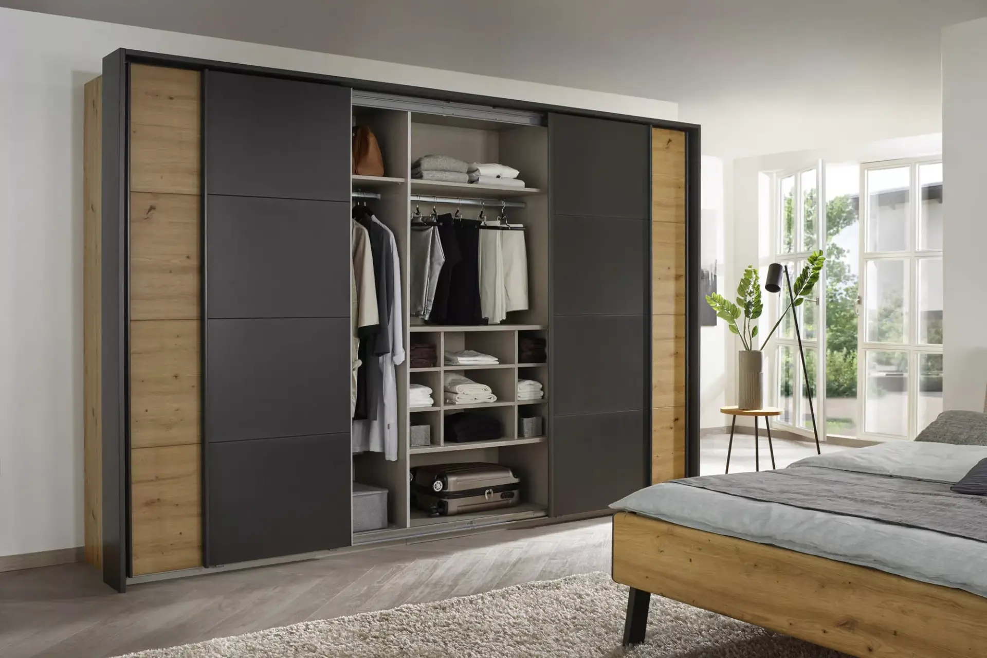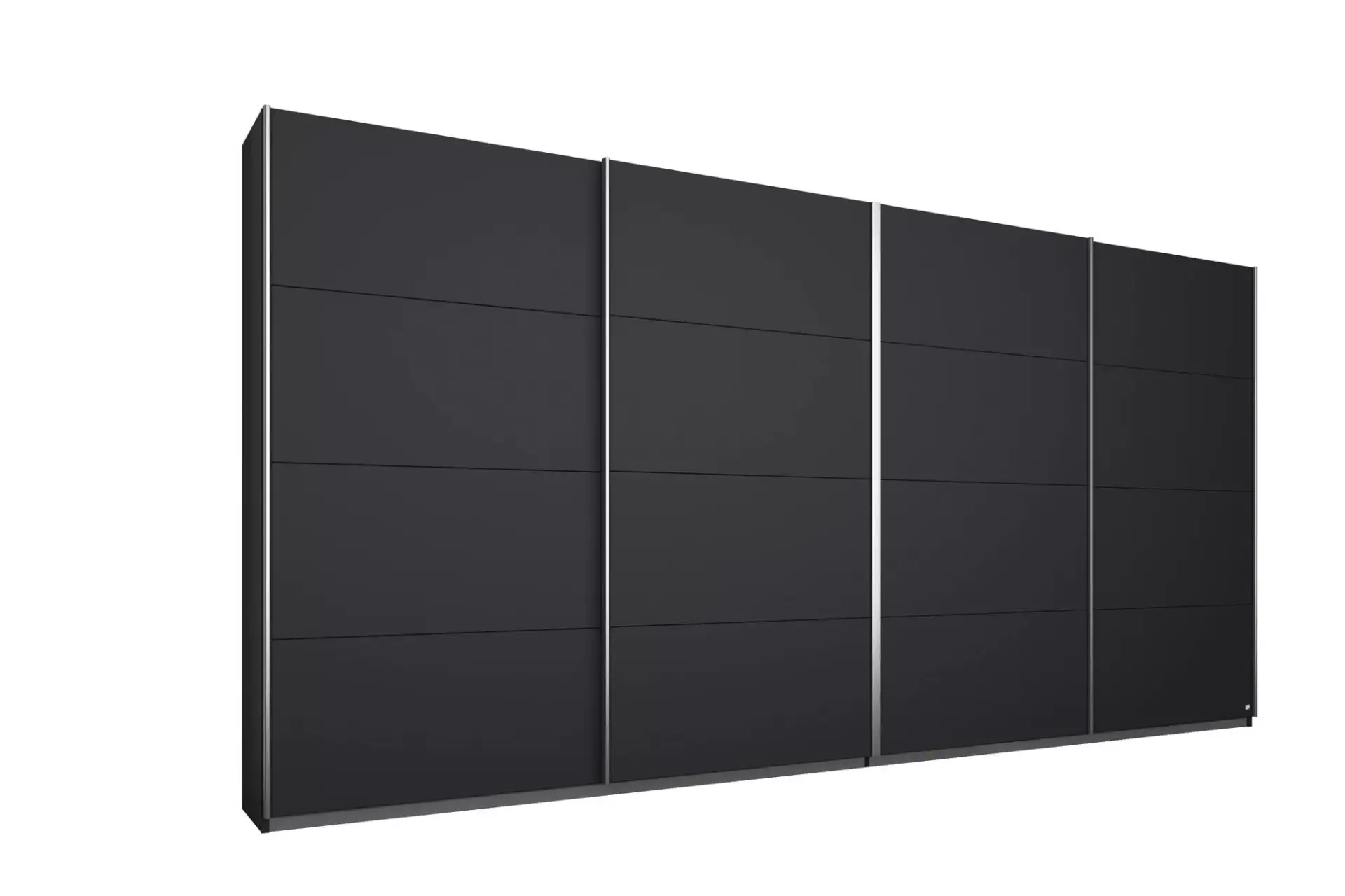 Schwebetürenschrank in neun Front/Korpusfarben und sieben Frontfarben in verschiedensten Zusammenstellungen mit Griffleisten