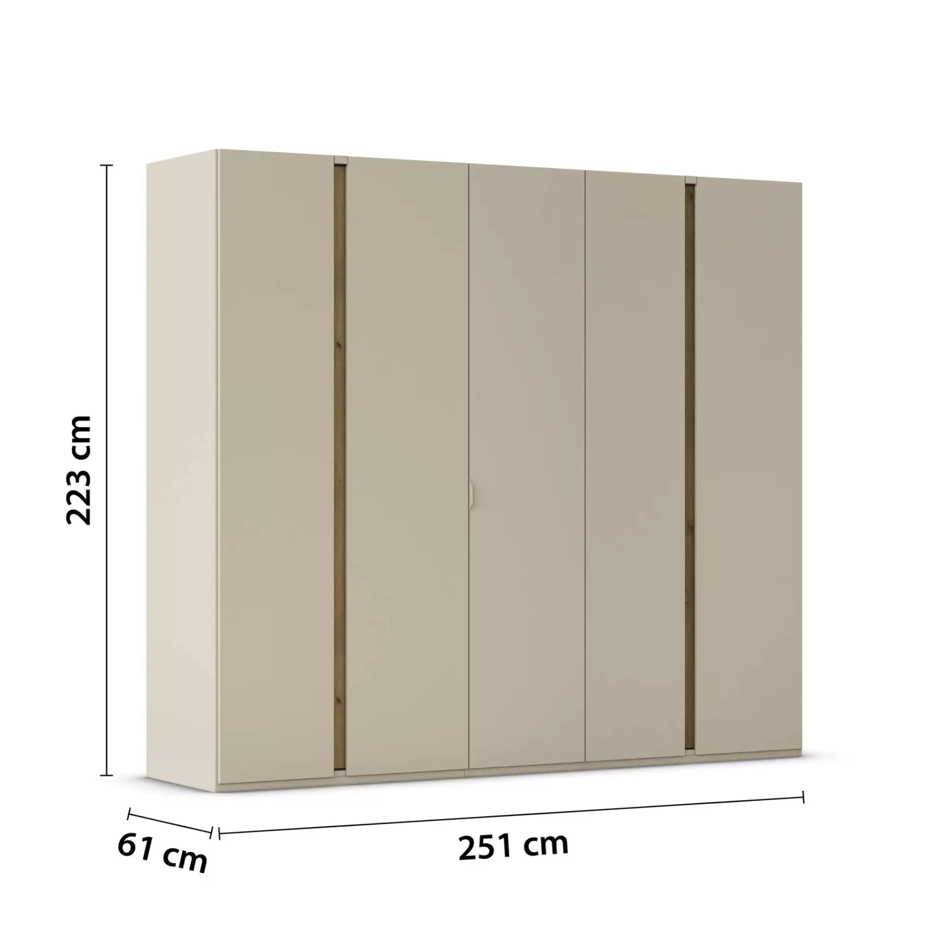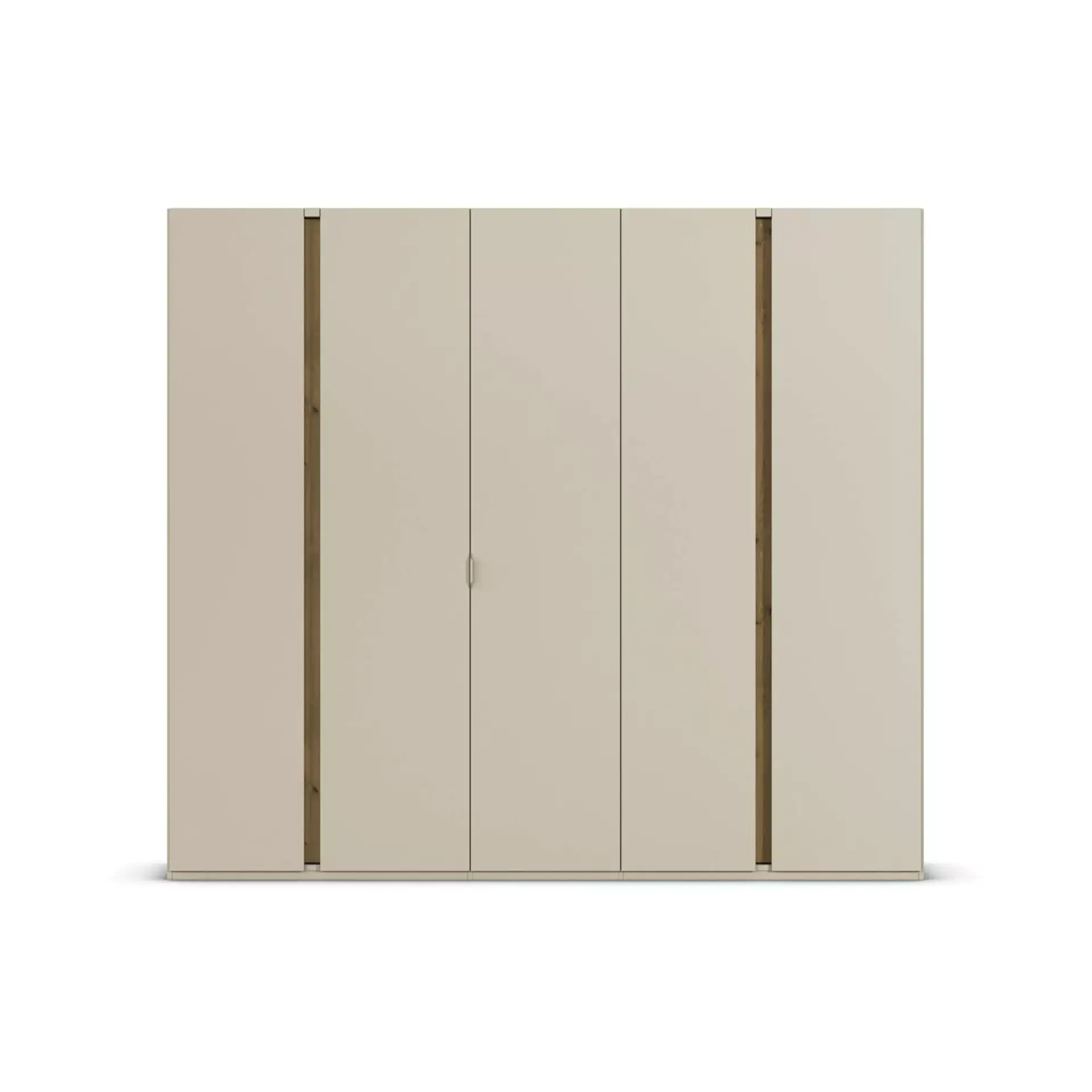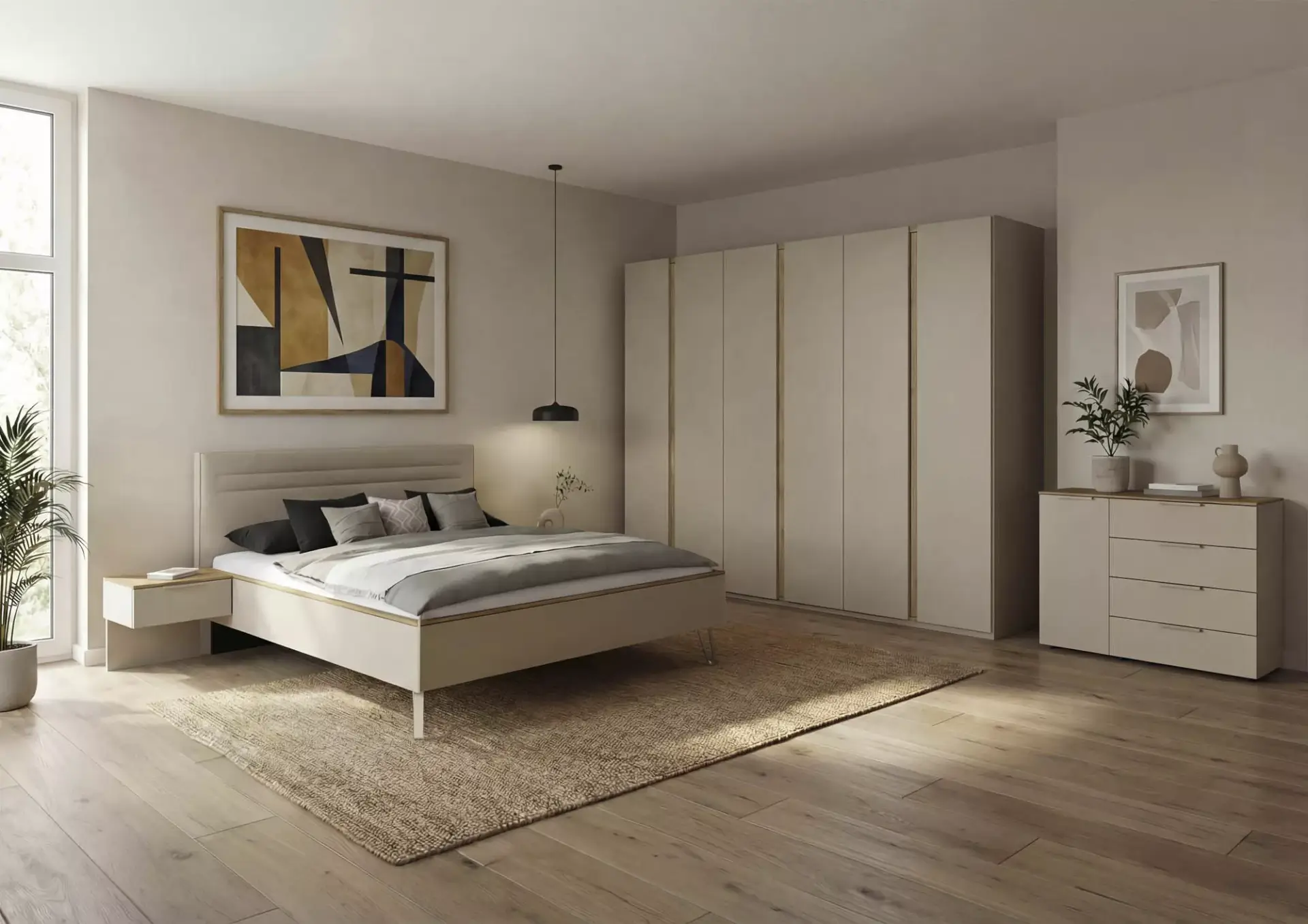 Schlafzimmer mit Front und Korpus in Champagner mit Absetzungen in Dekor Asteiche. Griffe korpusfarben.