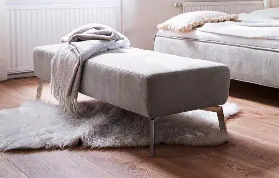 Große Hockerbank als Ablage mit lockerem, weichen Polsteraufbau. verschiedene Größen und Fußausführungen stehen bereit.