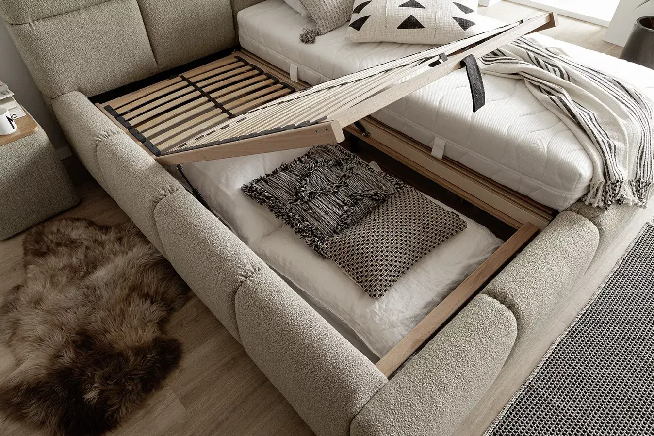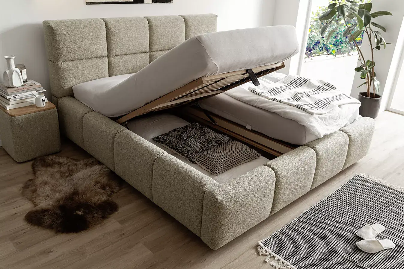 Mit der imposanten Waffeloptik setzt SAMBA klare Akzente und verleiht dem raum eine moderne und gemütliche Ausstrahlung. Dieses raffinierte Design wird von dem praktischen Stauraumfach ergänzt. Das Bett als Blickfang, mit praktischer Funktion.