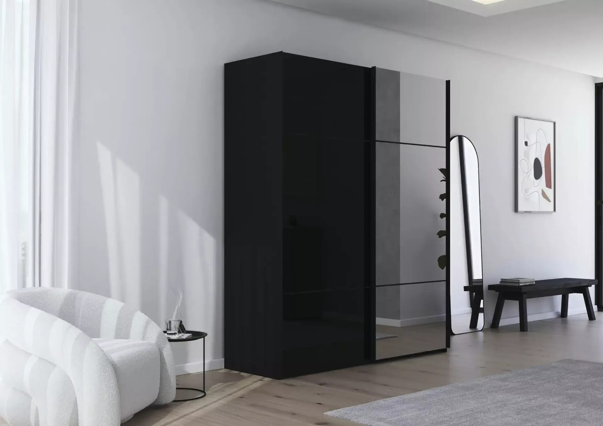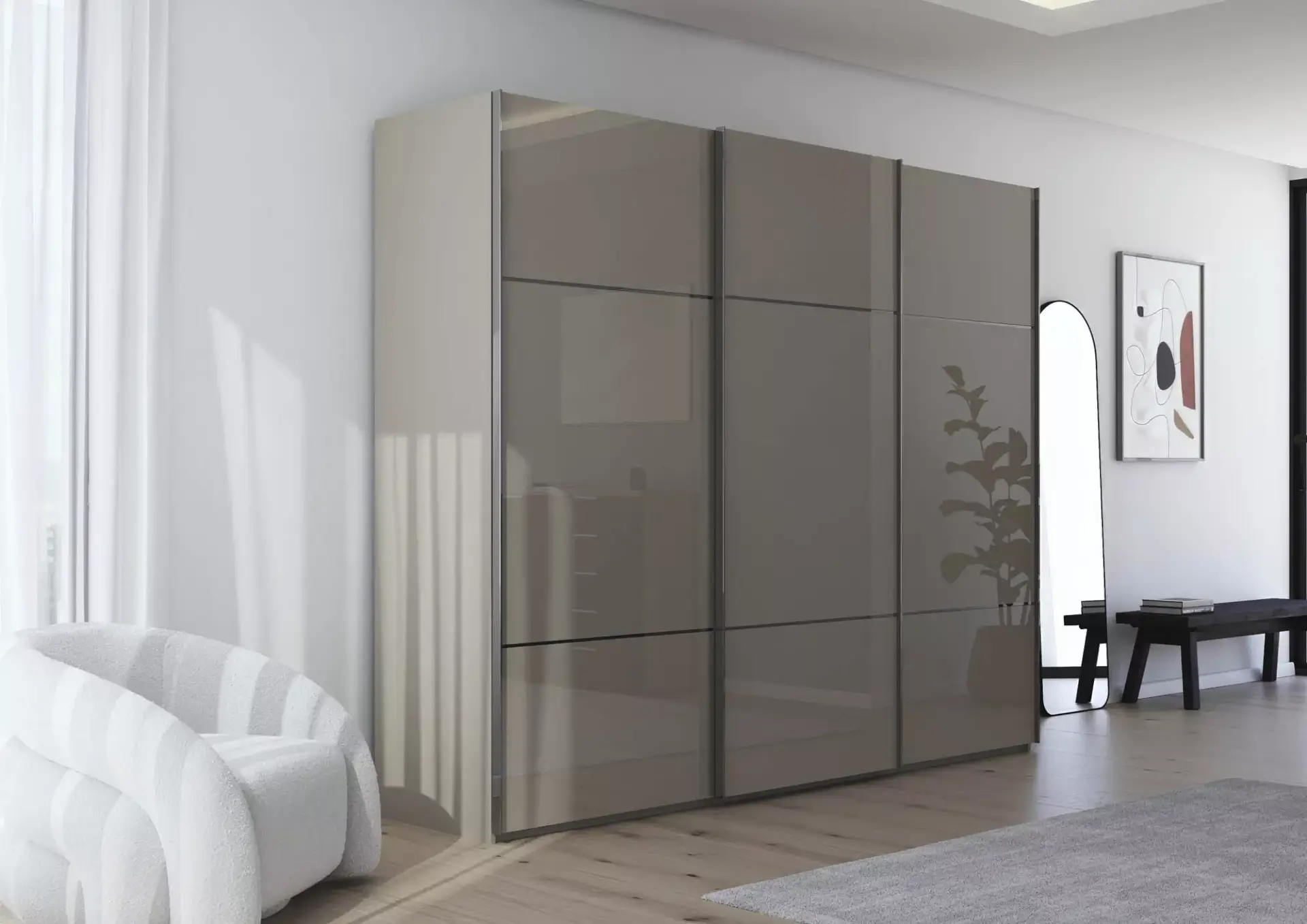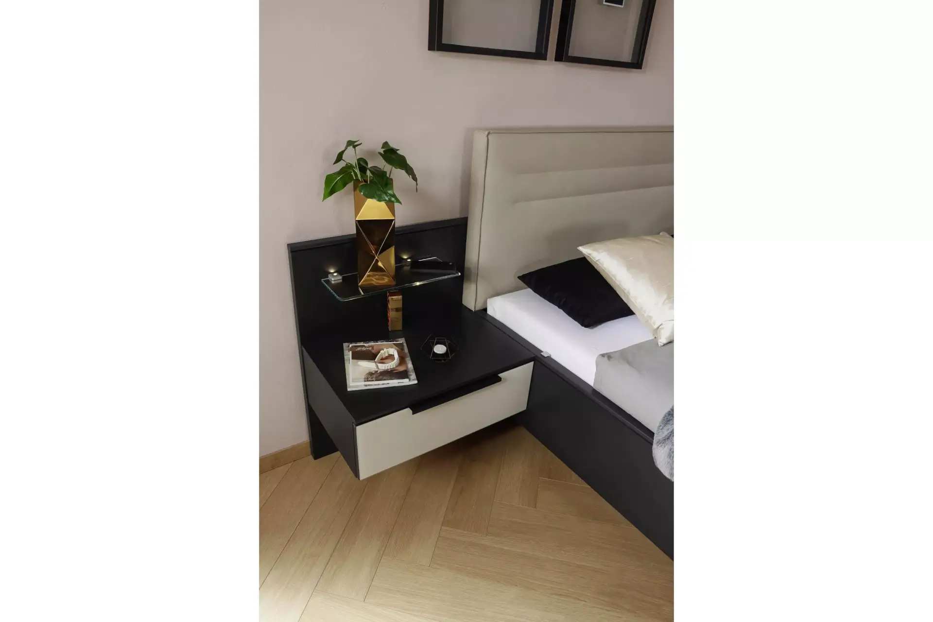Interessantes Schlafraumsystem mit Drehtürenschränken die beliebig vielen Anbauelementen kombiniert werden können. Eine große Auswahl an Front- und Korpusausführungen steht Ihnen zur Verfügung. Ebenso das große Beimöbelpogramm. Bettvarianten mit Bettrahmen in Dekor mit Eckspangen in alu-, chromfarben, schwarz oder in Korpusfarben. Ebenso in teilmassiv mit massiven Fußteil. Kopfteil in Lederoptik, Webstoff oder Massivholz. Alles ist möglich.