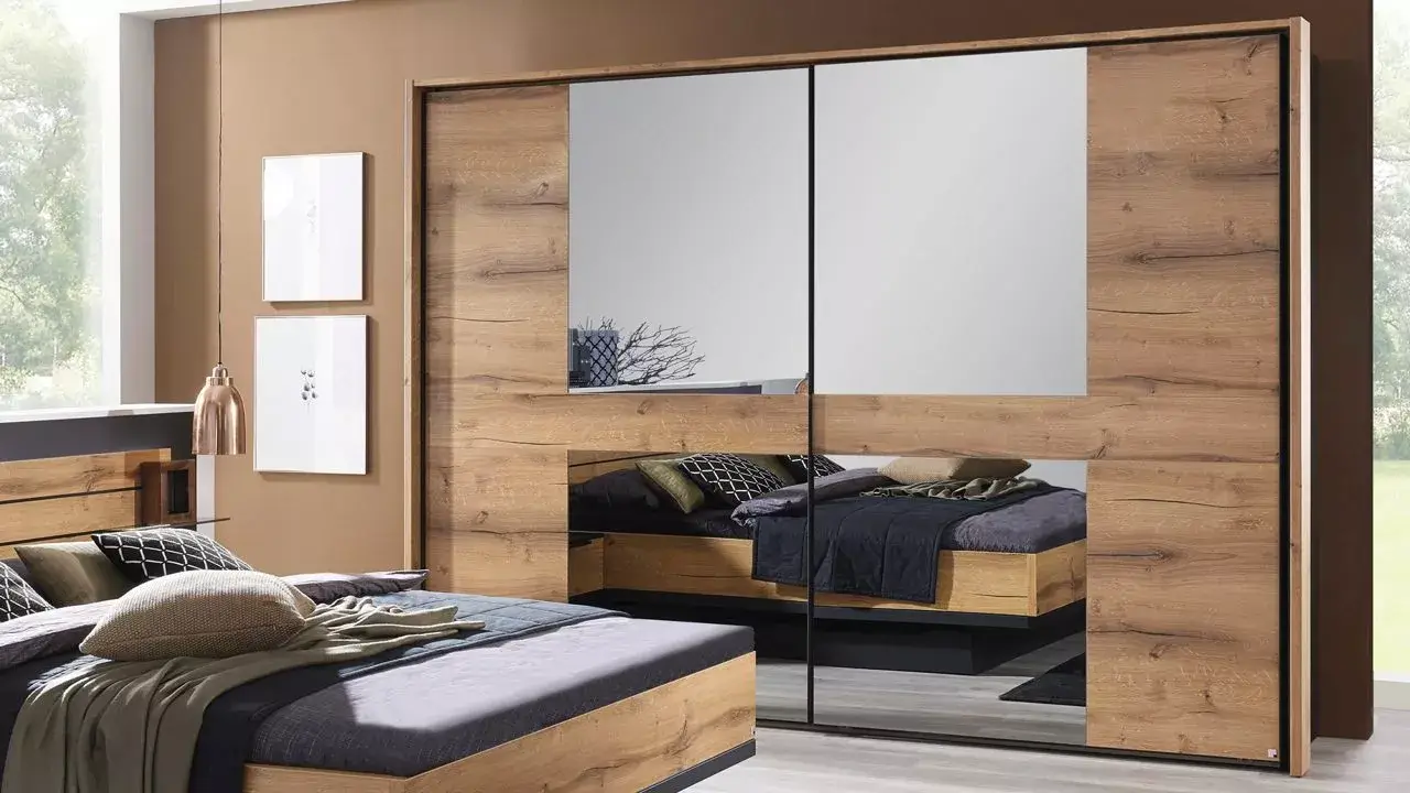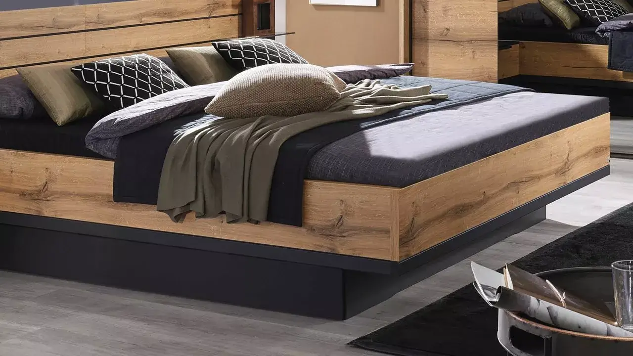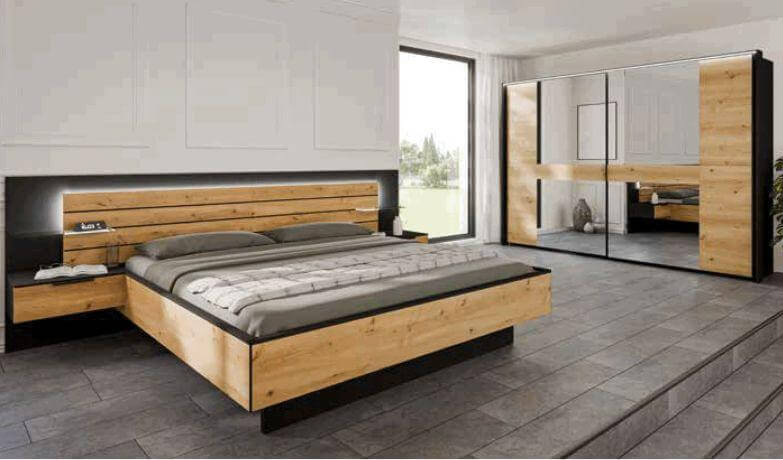 Modisches Schlafzimmer mit Korpus und Front in schwarz matt und mit Absetzungen in Dekor-Druck Eiche Sanremo dunkel.