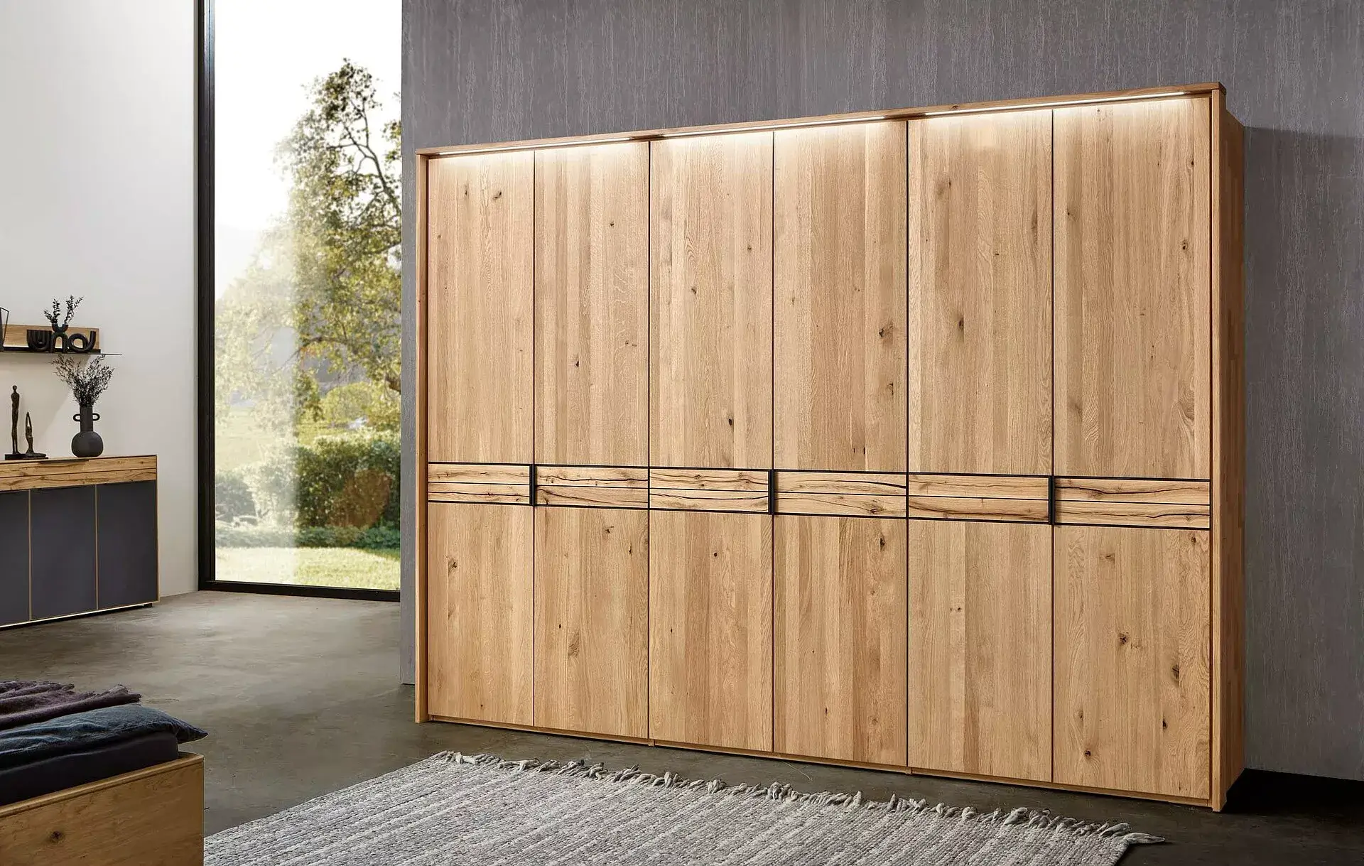 Diese neue Schlafzimmer Serie wird geprägt durch den stark gebürsteten Balkeneiche Akzent. Diese schöne , greifbare Haptik dieses Akzentes und die ansprechende Optik sind der absolute Hingucker. In Ihrem Schlafzimmer entsteht eine gemütliche entspannte Atmosphäre mit Erholungseffekt. Durch die optionale LED-Beleuchtung können Sie diesen Effekt unterstreichen. Sie erhalten die Bettanlage, Kleiderschränke, Nachtkonsolen und auch Kommoden in unterschiedlichen Breiten und auf Anfrage auch in Sondermaßen!