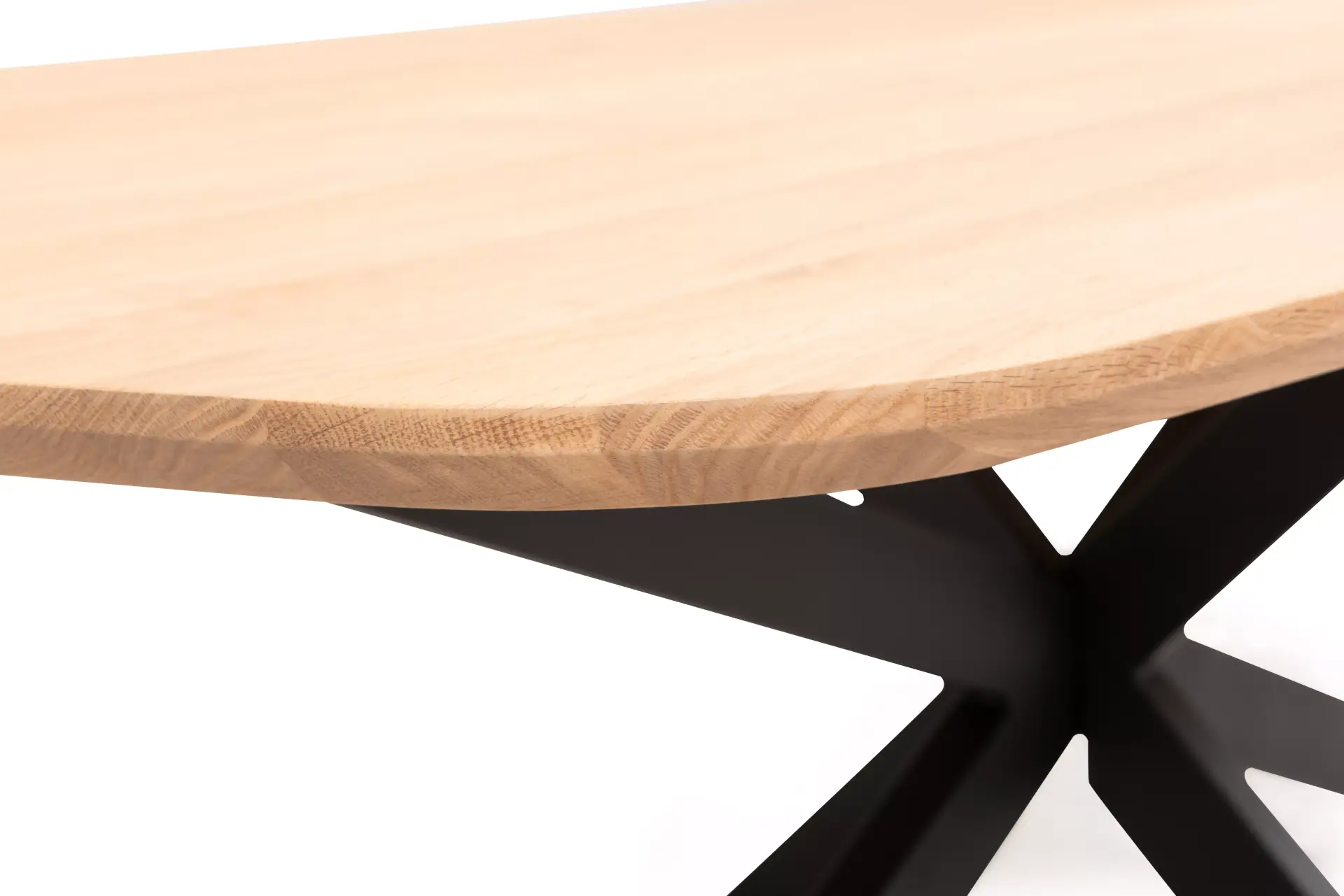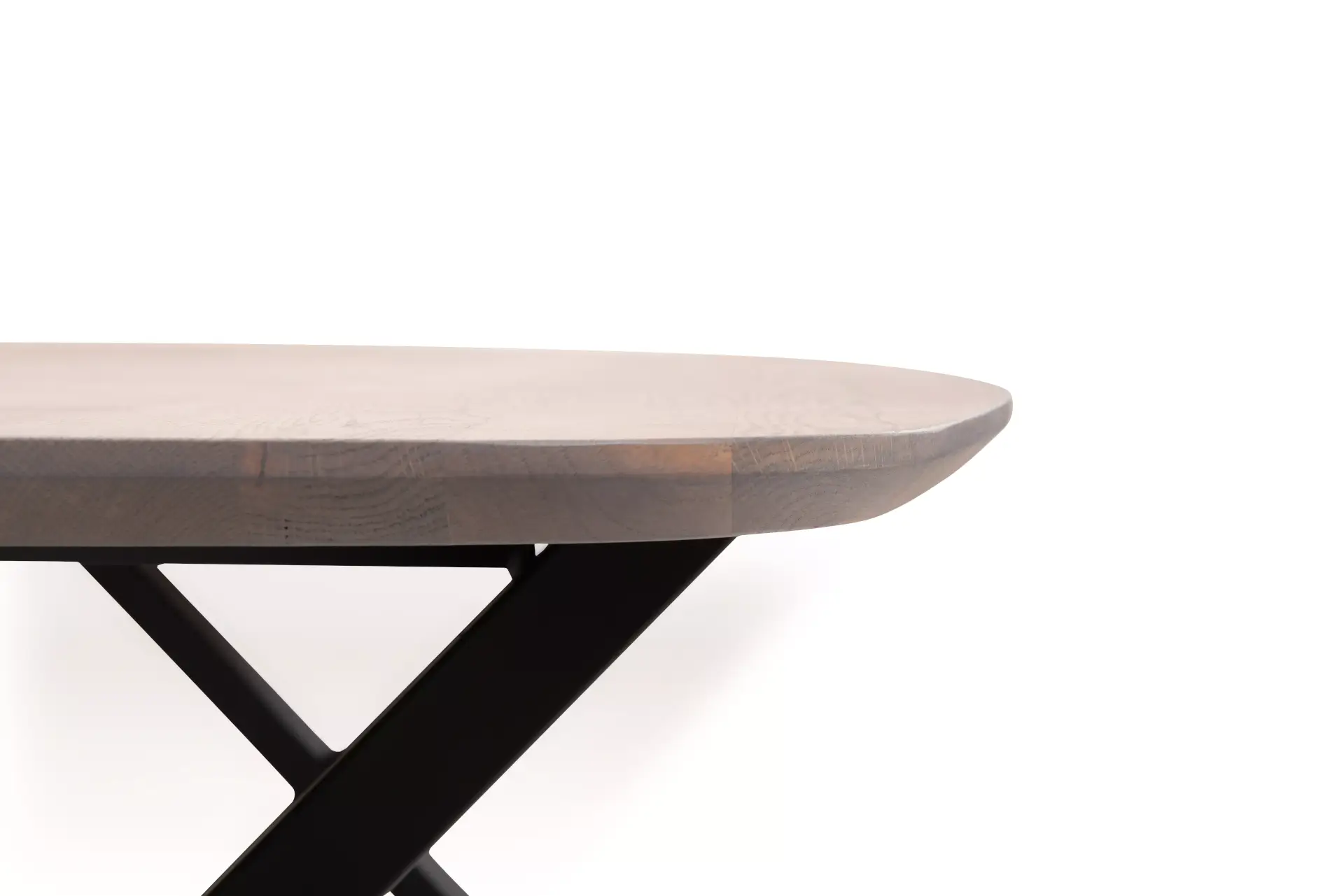 Ausziehbarer Tisch in verschiedenen Massiv-Holz-Farben und einem schwarzen Metallgestell.