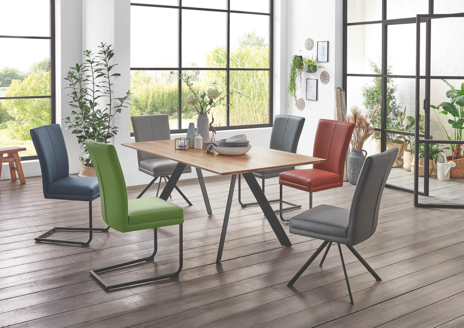 Linea Dining Stuhlprogramm in verschiedenen Holz-Gestellausführungen, Metallschwinger und natürlich einer großen Farbpalette bei den Bezugsstoffen. Beachten Sie unseren Typenplan!