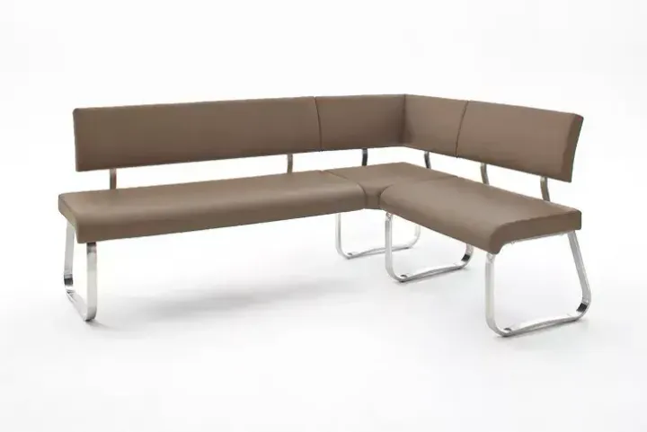 Moderne Bank oder Eckbank mit einem Flachrohr-Edelstahl-Gestell in Edelstahl gebürstet.