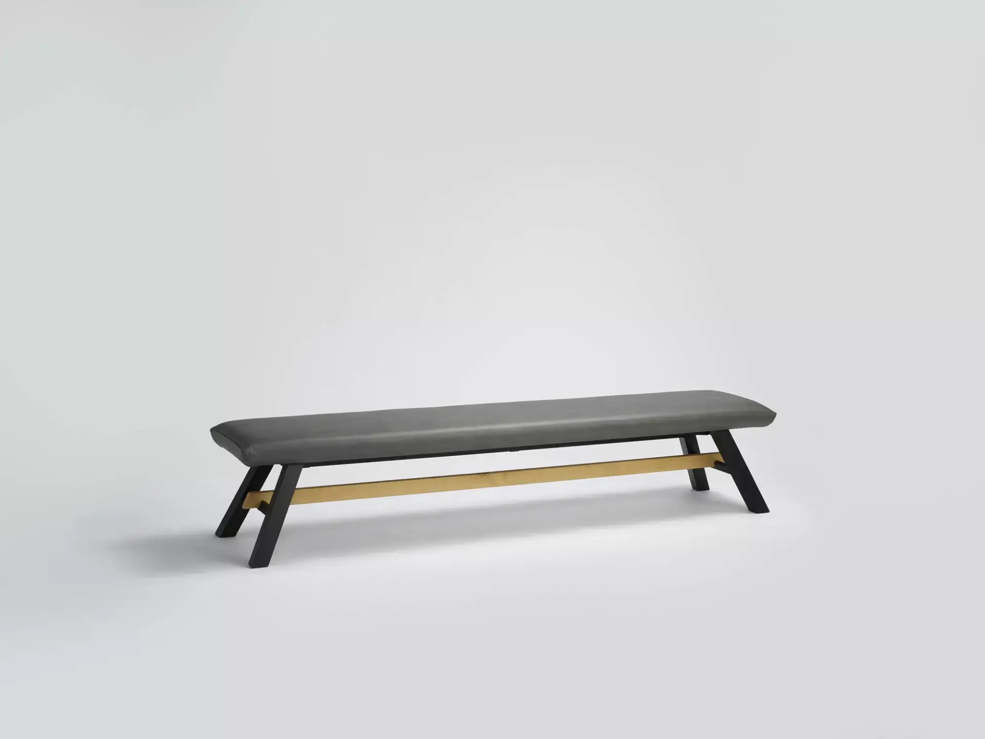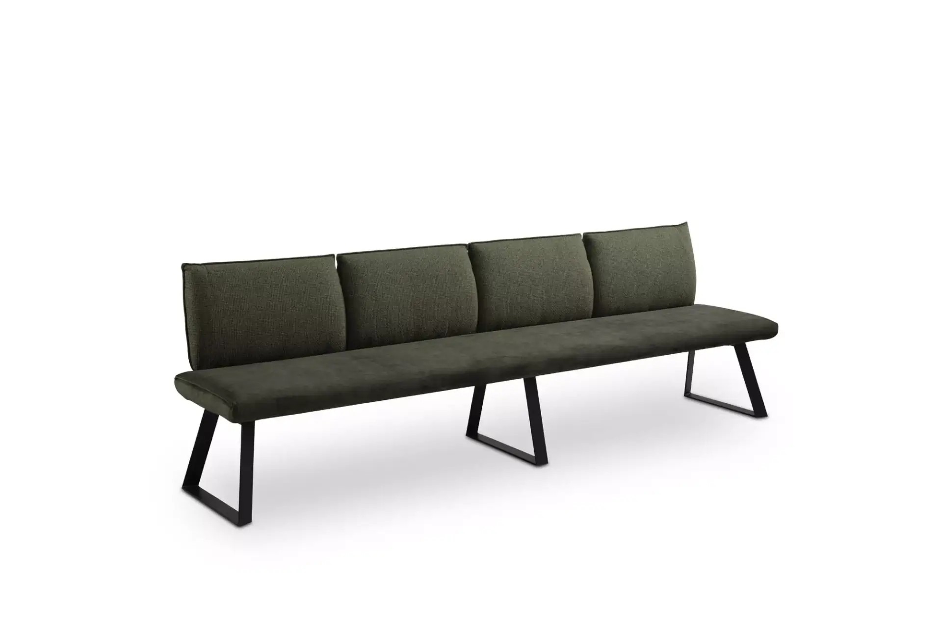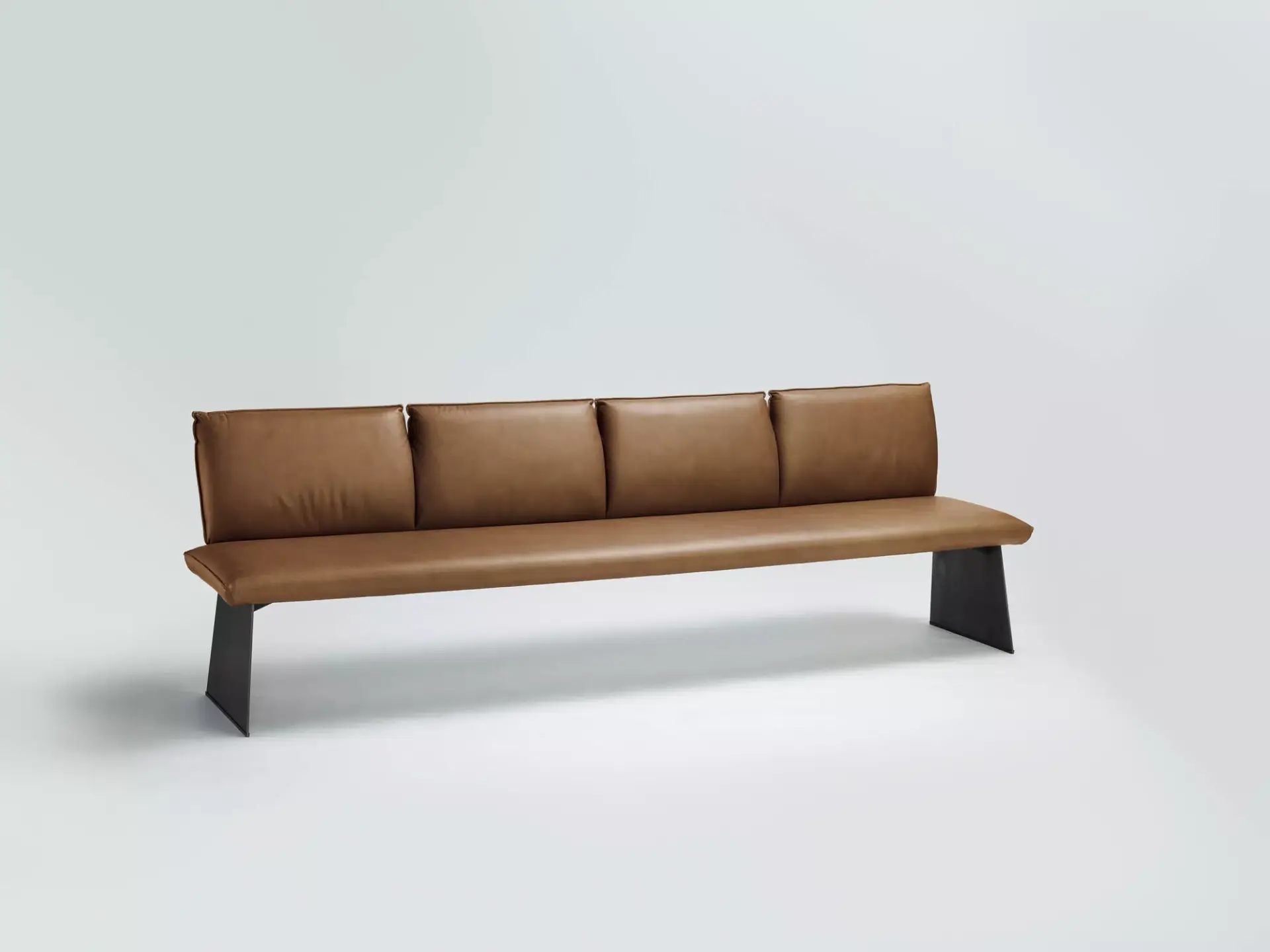 Neues Bank-Modell mit Lehne in Kissenoptik. Sowohl Sitz als auch Lehne sind mit Kedernaht gefertigt. Um eine durchgängige Designsprache zu halten, wurden die Gestelle in A-Form aus pulverbeschichtetem Metall mit Holzsteg gefertigt.
