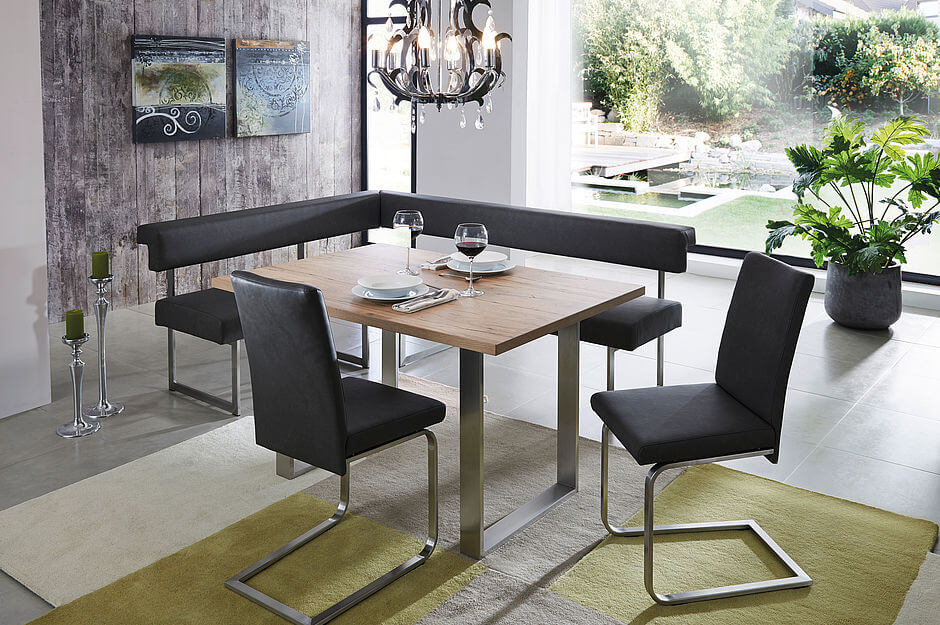 einer großen Auswahl an Hölzern als Tischplatte. Moderne Bezugsstoffe ergeben die wunderbare Harmonie.