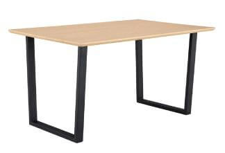 Ein Esstisch mit einer MDF-Tischplatte in Eiche Natur Nachbildung und einem Kufengestell in Metall schwarz.