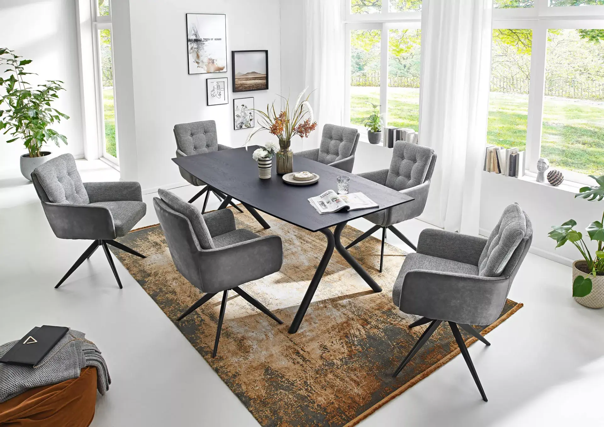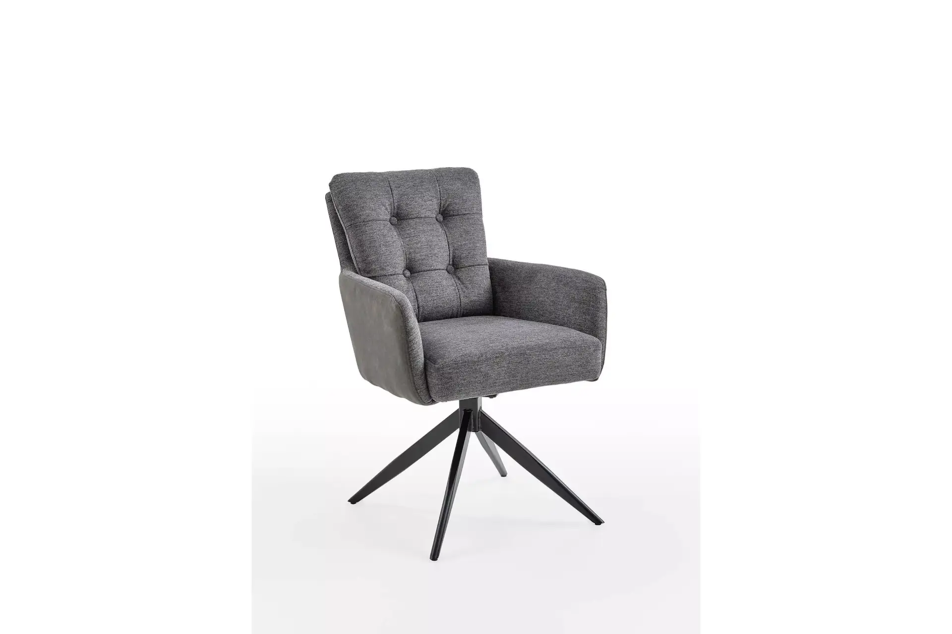 Komfort-Polsterstuhl "Tosca" mit Gestell Stativ, Eisen schwarz, 180° drehbar mit Rückholfunktion Bezug Innenseite Webstoff "Brego anthrazit". Bezug Außenseite Microfaser "Cowboy grey" mit Micro-Federkern im Sitz.