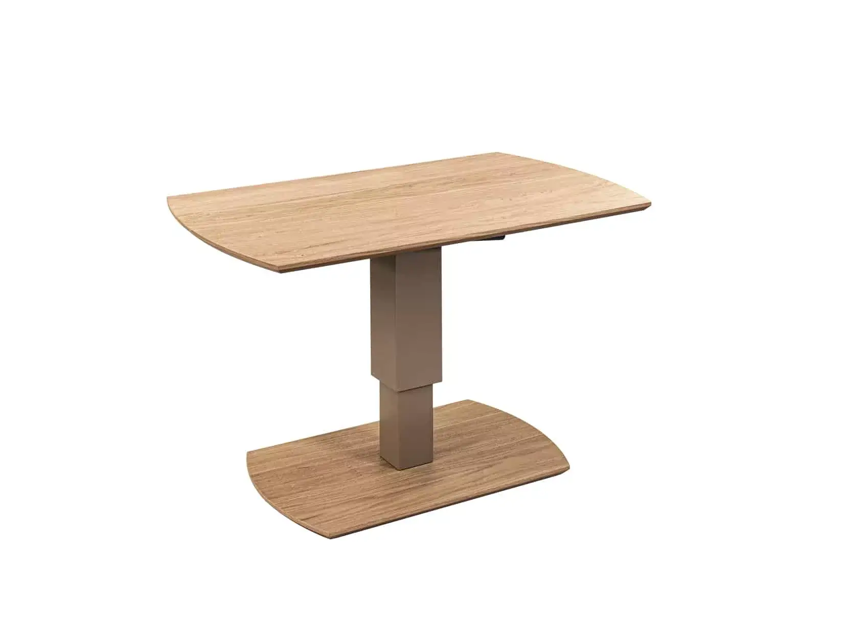 Funktions-Couchtisch mit Tischplatte in Wildeiche furniert MDF Trägerplatte, Gestell llse Lift Mechanik, Säule MDF RAL 1019 graubeige lackiert, Bodenplatte Wildeiche furniert, Lenkrollen, Beizton Wildeiche bianco lackiert.