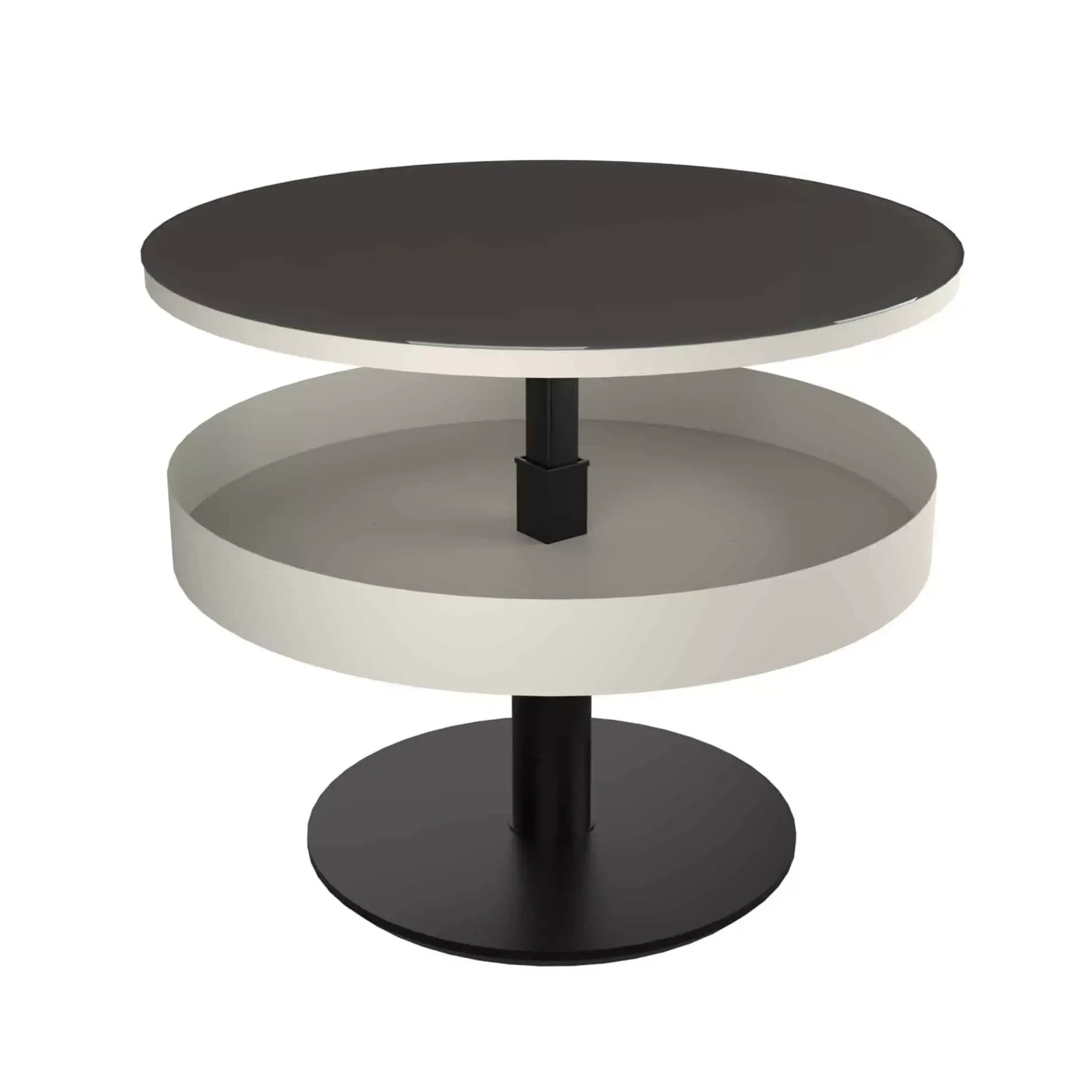 Couchtisch mit Tischplatte Satinato RAL 7022 umbragrau hinterlackiert auf Trägerplatte Dekor RAL 7044 seidengrau, Gestell Ilse Hydro Lift Mechanik anthrazit metallic lackiert, Ablagekasten Stahl RAL 7044 seidengrau lackiert, Säule RAL 7022 umbragrau lackiert, Bodenplatte RAL 7022 umbragrau Schliffoptik lackiert, Beizton: umbragrau/seidengrau, B/H ca. 75/44-62 cm.