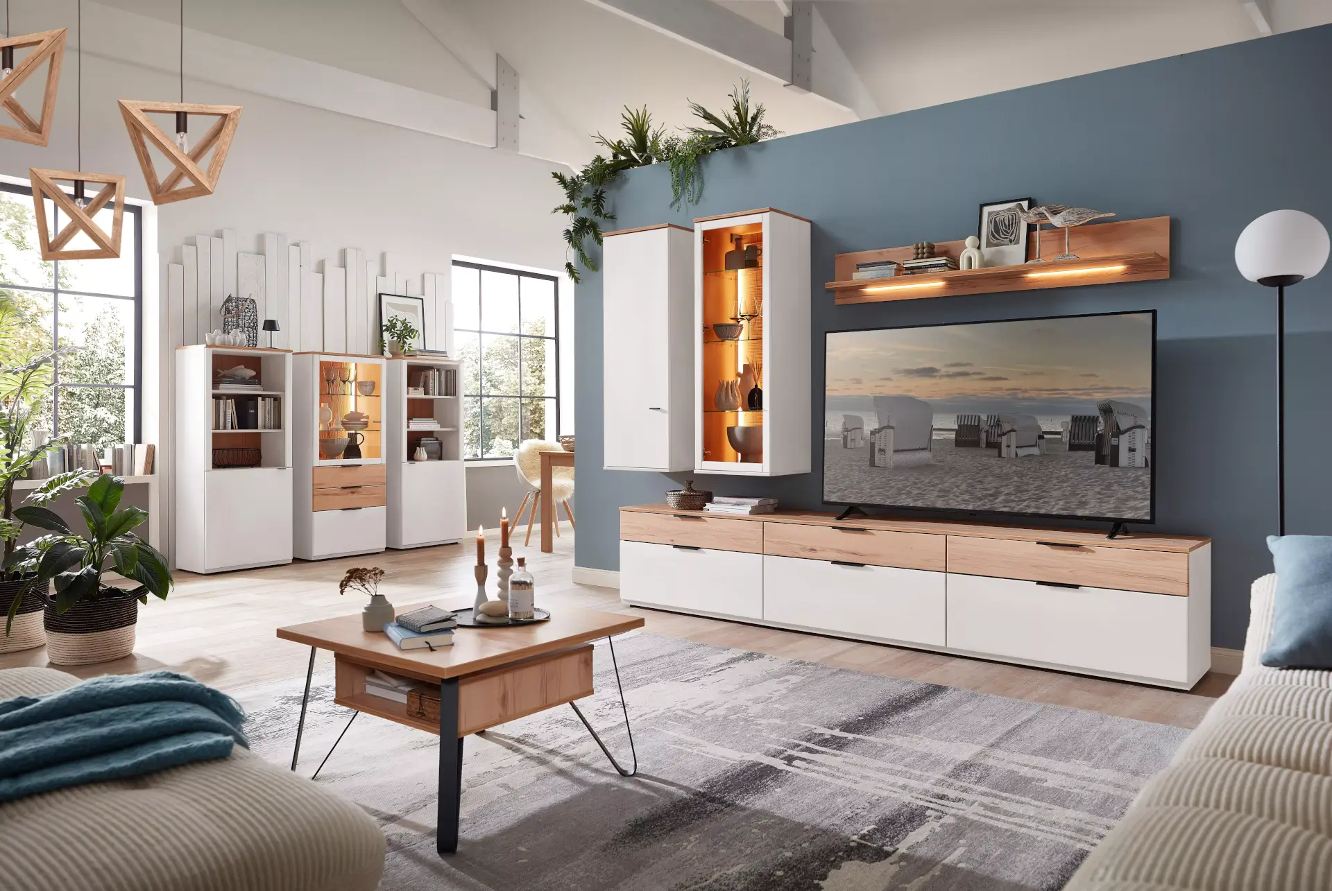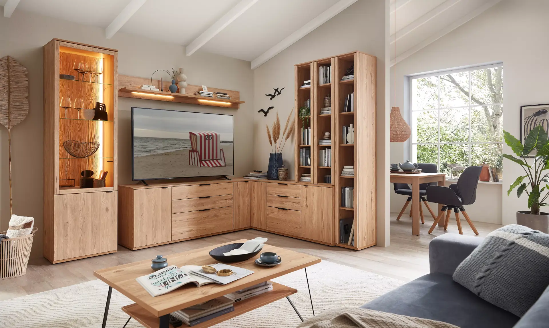 Angesagte hochwertig gefertigte Wohnwand mit Front und Korpus in Risseiche, Balkenbuche, Akazie als Nachbildung oder Tonweiss matt. Eine große Typenauswahl mit vielen Einrichtungsbeispielen, je nach Raumgröße, steht Ihnen zur Verfügung.