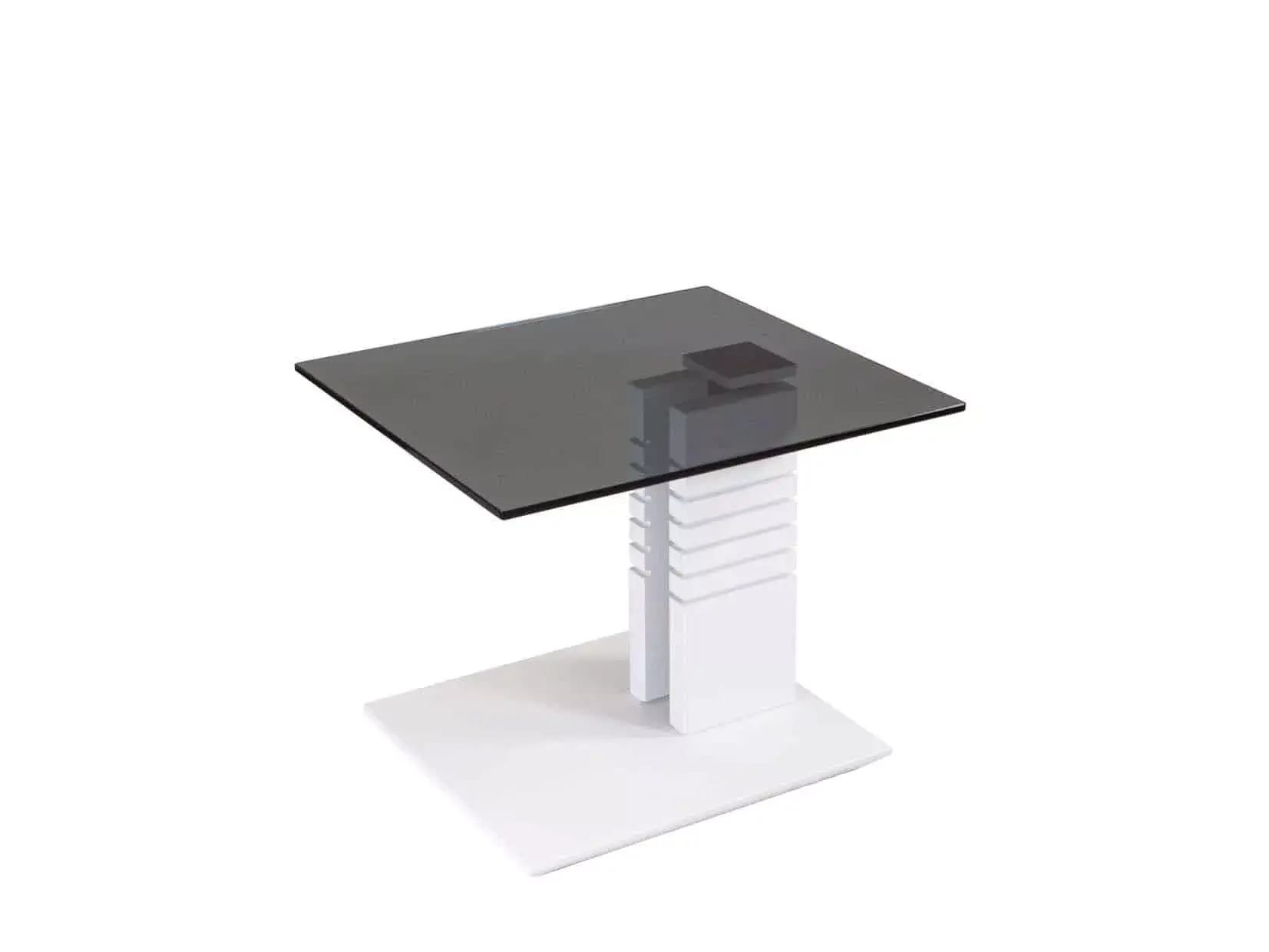 Platte Parsolgrau 10 mm (ESG), Gestell Illse Hydro Lift Mechanik, Liftsäulenverkleidung Wildeiche massivholz, Bodenplatte Wildeiche furniert, Metallteile anthrazit metallic lackiert, Rollen, Beizton Parsolglas grau/wildeiche bianco lackiert, BHT ca. 55/47-65/47 cm