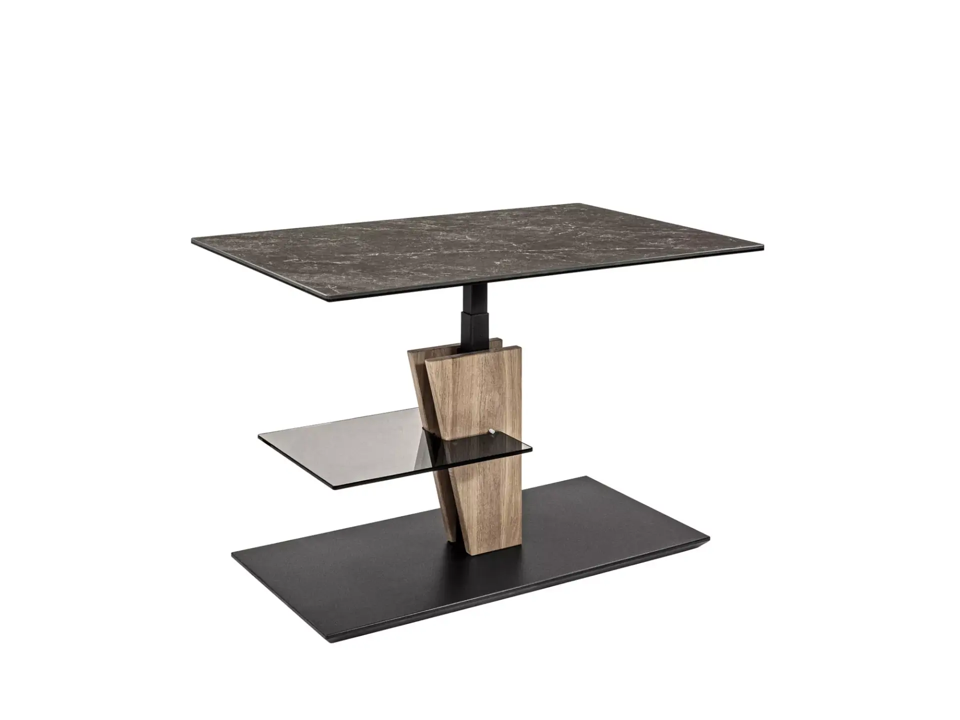Tischplatte Keramik nero Glasklar (ESG), Gestell Illse Hydro Lift Mechanik anthrazit metallic lackiert, Wangen Wildeiche massivholz, Ablageplatte Parsolglas grau, Bodenplatte anthrazit metallic Schliffoptik lackiert, Rollen, Beizton Keramik nero/Wildeiche geölt, BHT ca. 90/47-65/65 cm