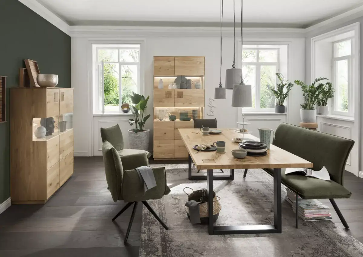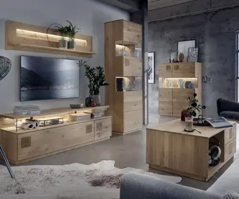 Dieses Wohnprogramm ist zeitlos gestaltet und ergänzt sich hervorragend mit Ihrem rustikal eingerichteten Zuhause sowie mit Ihrem hochmodernen Design. Die elegant verarbeitete Oberfläche in Kombination mit beleuchteten Rückwänden sorgt für ein gemütliches Ambiente. Das gesamte Programm ist in massiver Wildeiche wahlweise natur-geölt oder bianco-geölt erhältlich. Die Fronten sind mit Hirnholz-Elementen ausgeschmückt, was ein weiteres Highlight der Möbelstücke darstellt. Die Rückwände sind geschrubbt und gebürstet und können mit LEDs beleuchtet werden. Mit der Push to Open Funktion ist dieses Möbel nicht nur edel anzuschauen, sondern auch angenehm zu bedienen.