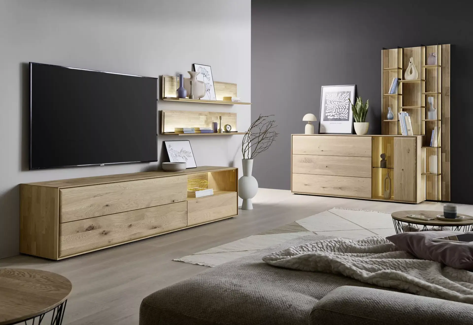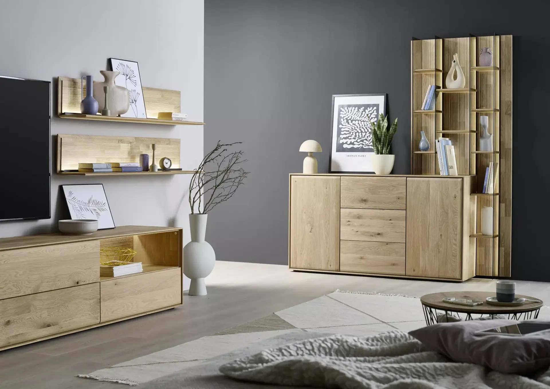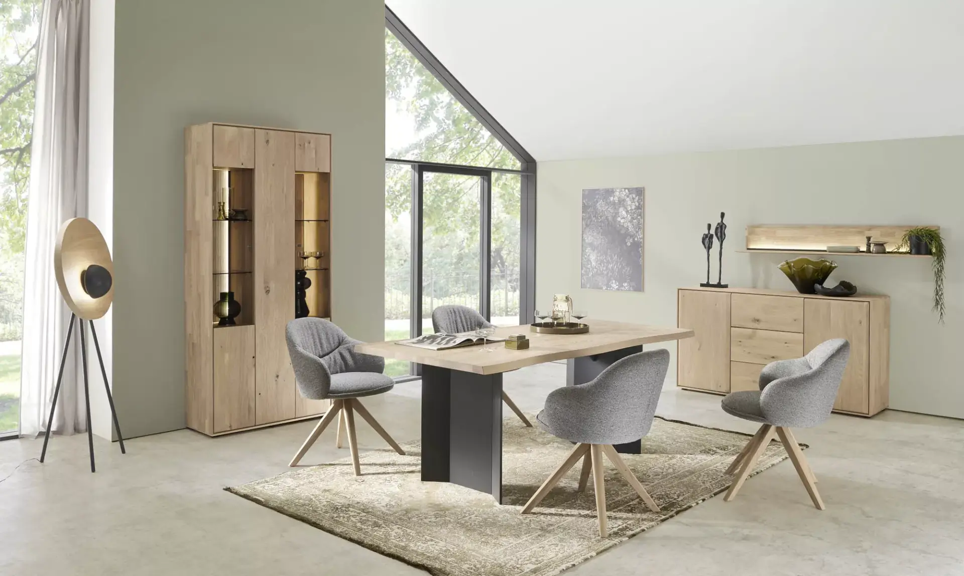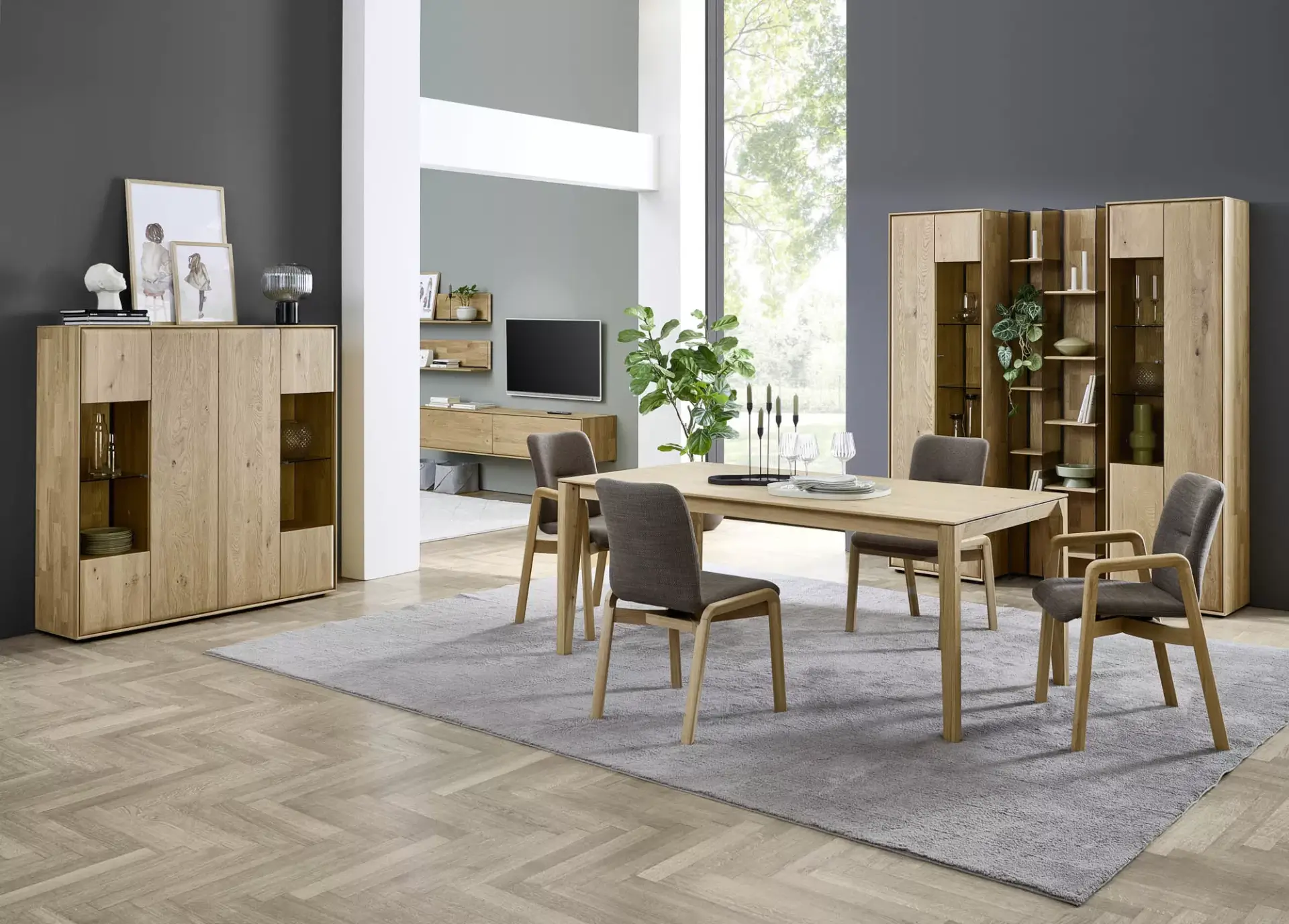 Passgenaue Möbel für Ihr Zuhause. Entdecken Sie dieses umfangreiche Programm in Kerneiche Natur massiv gebürstet mit geschroppter Rückwand. Erweiterbar auf ein komplettes Esszimmerprogramm.
