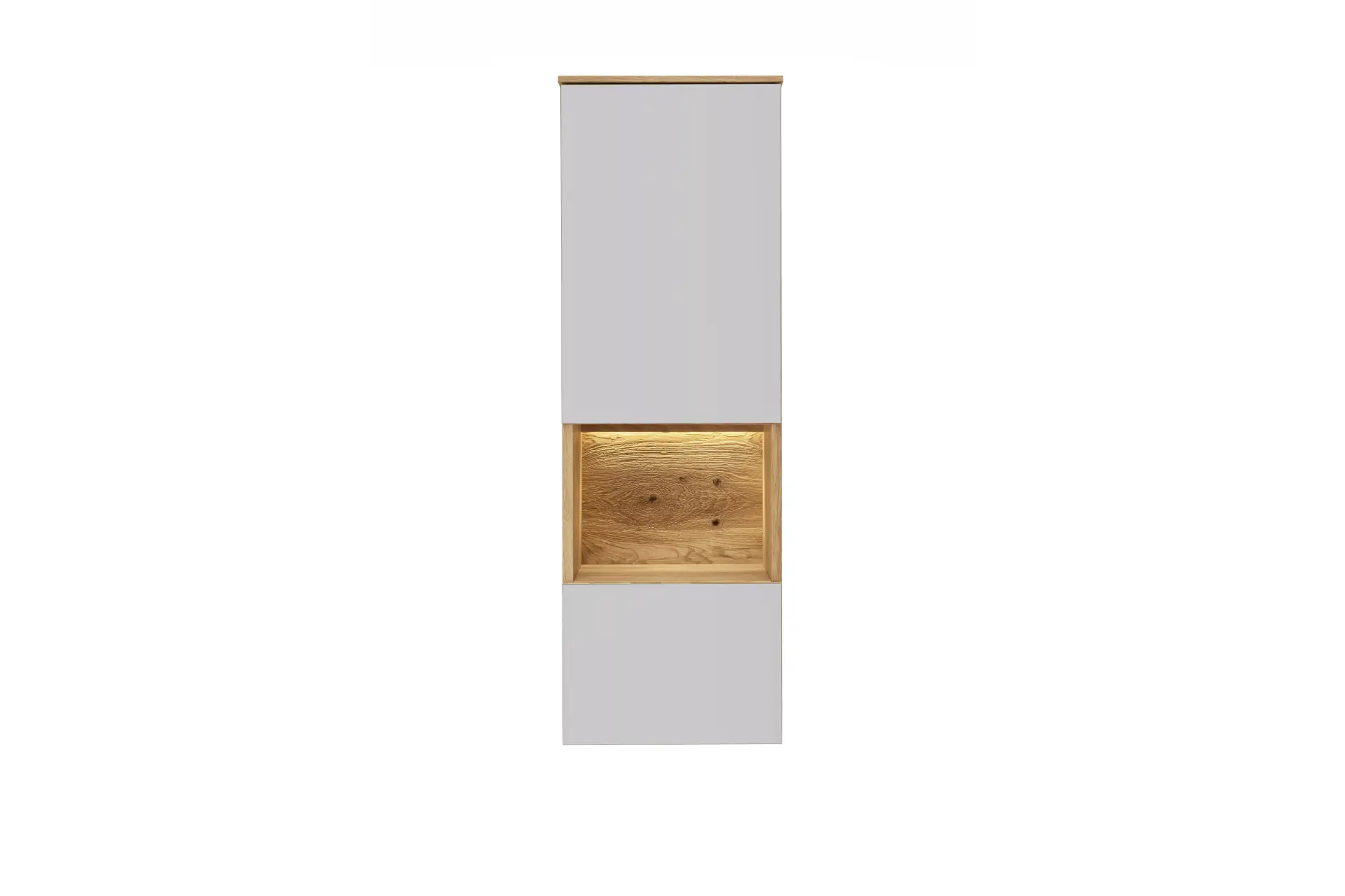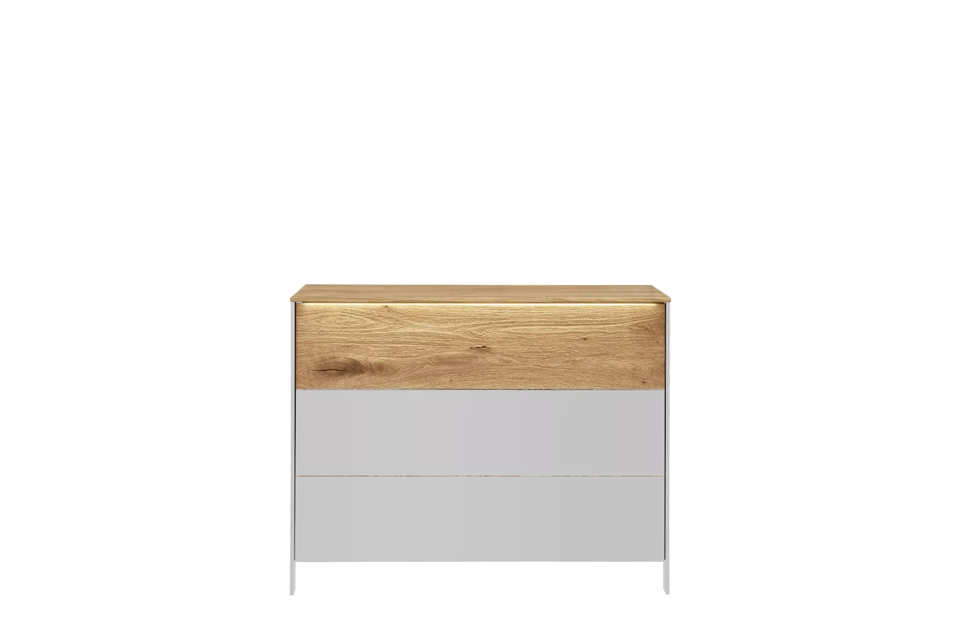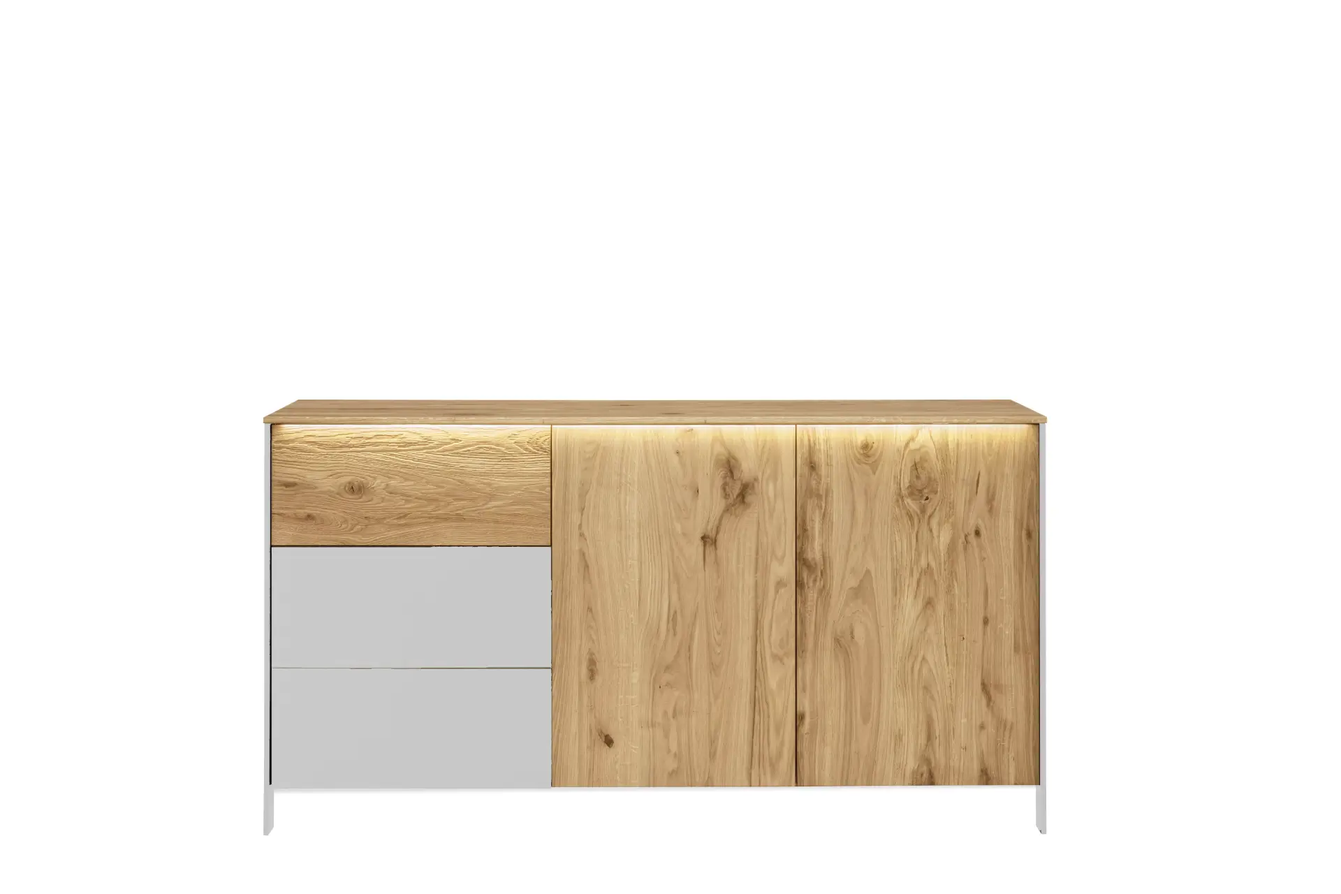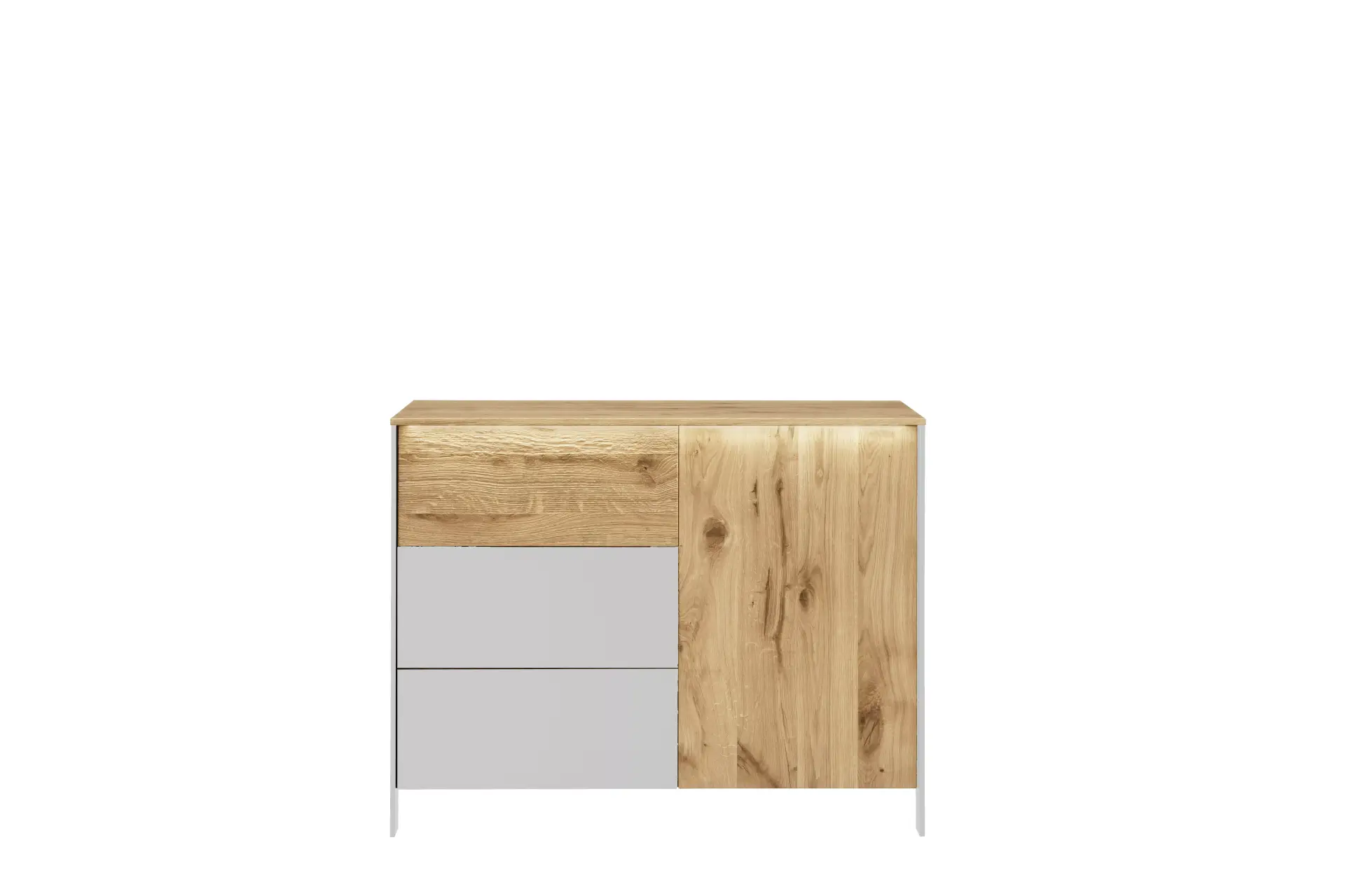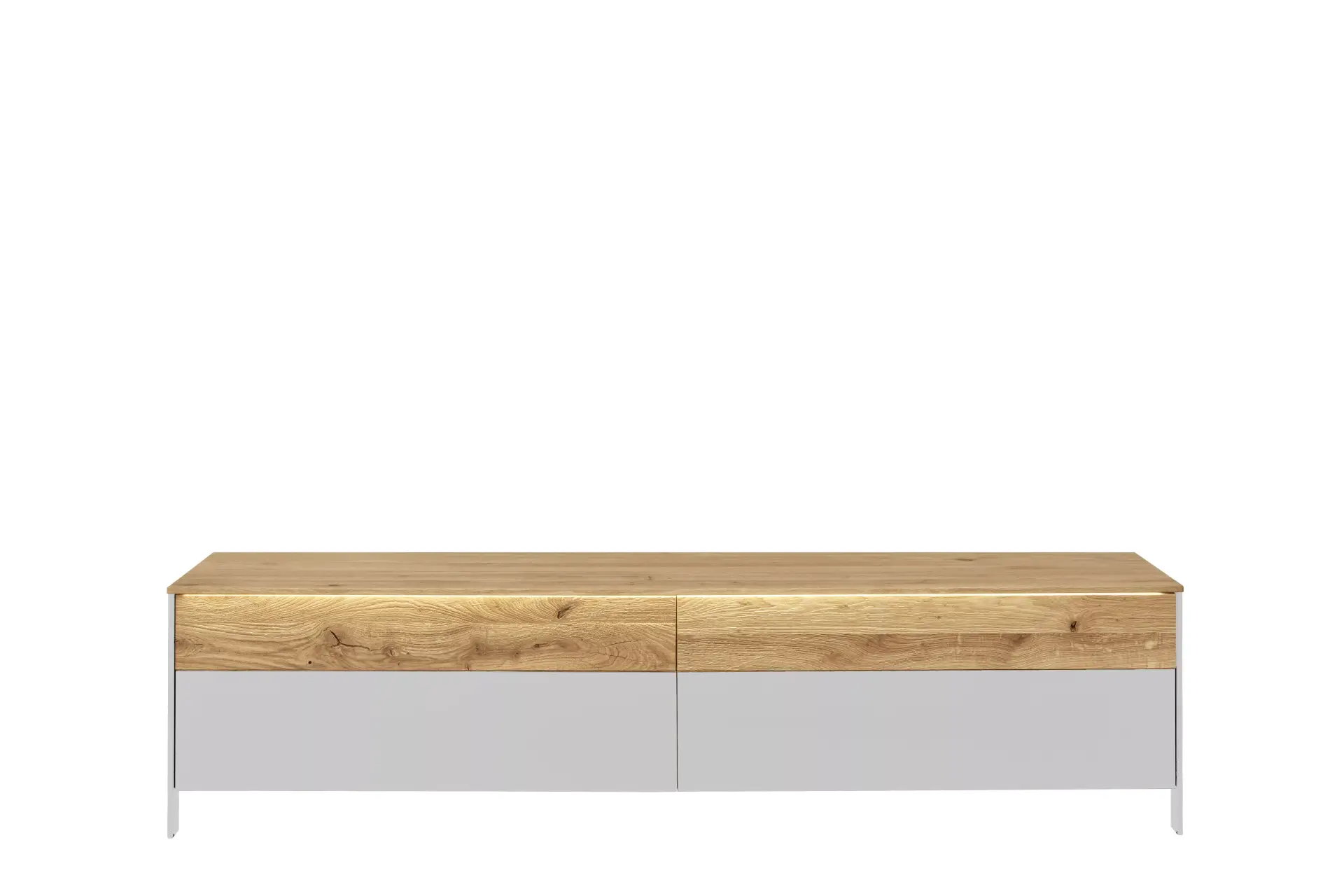 Wohnprogramm mit Front in Wildeiche und Korpus in Eiche geölt. Absetzungen in cremeweiß.
