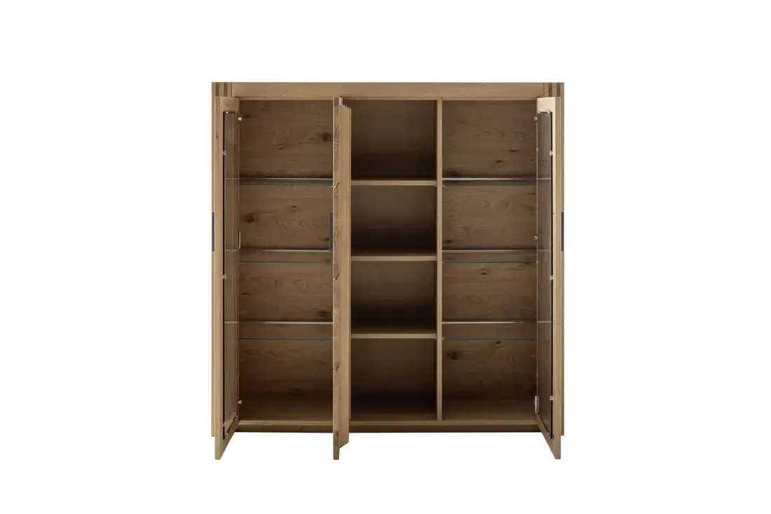 Angesagtes Wohnprogramm mit Front in Ast/Balkeneiche massiv mit durchgehender Lamelle in Kristallleiche geölt.